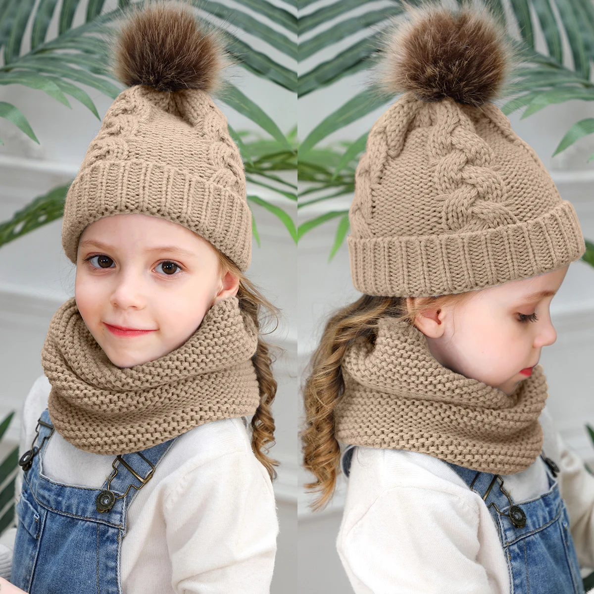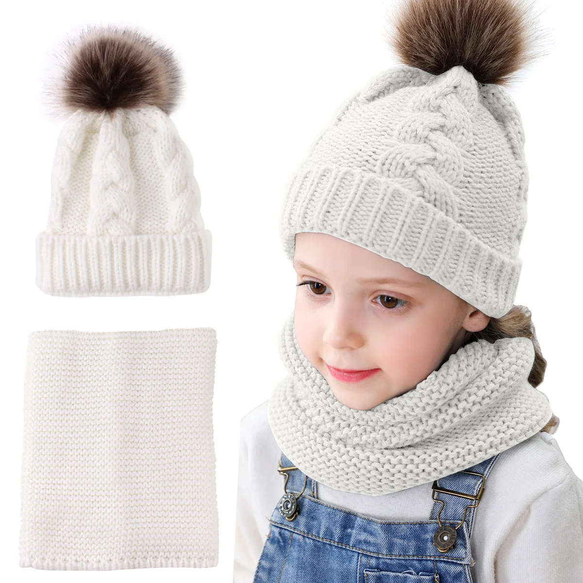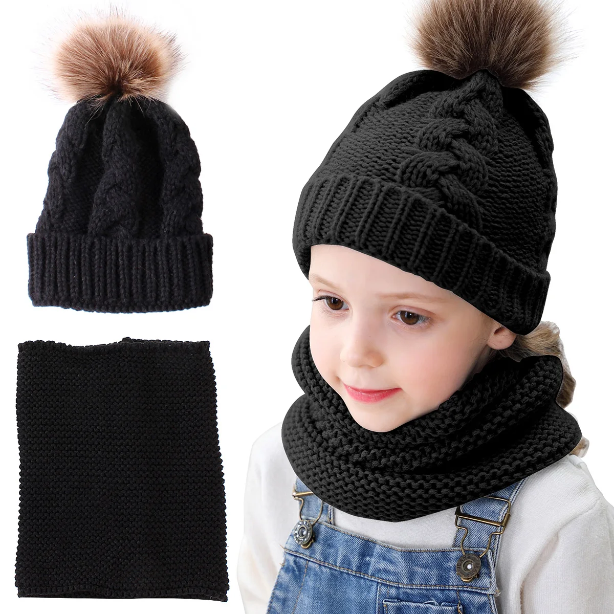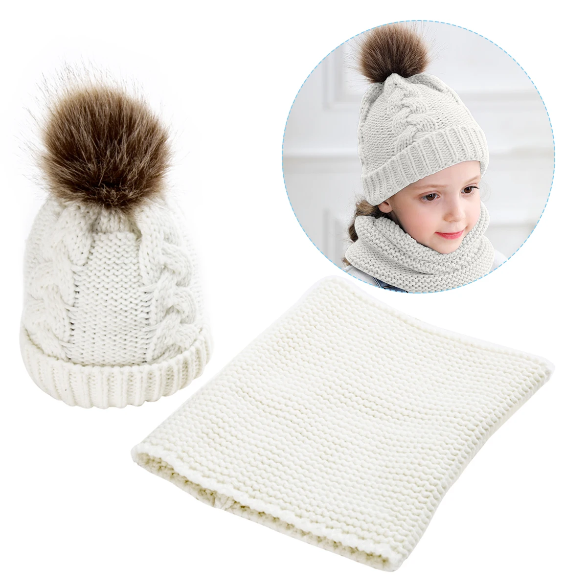 Комплект из 2 предметов для девочек и мальчиков, шапка + шарф, комплект для малышей, детей, зимняя теплая меховая шапка, круглый шарф, Детская вязаная шапка + шарф, сохраняющий тепло