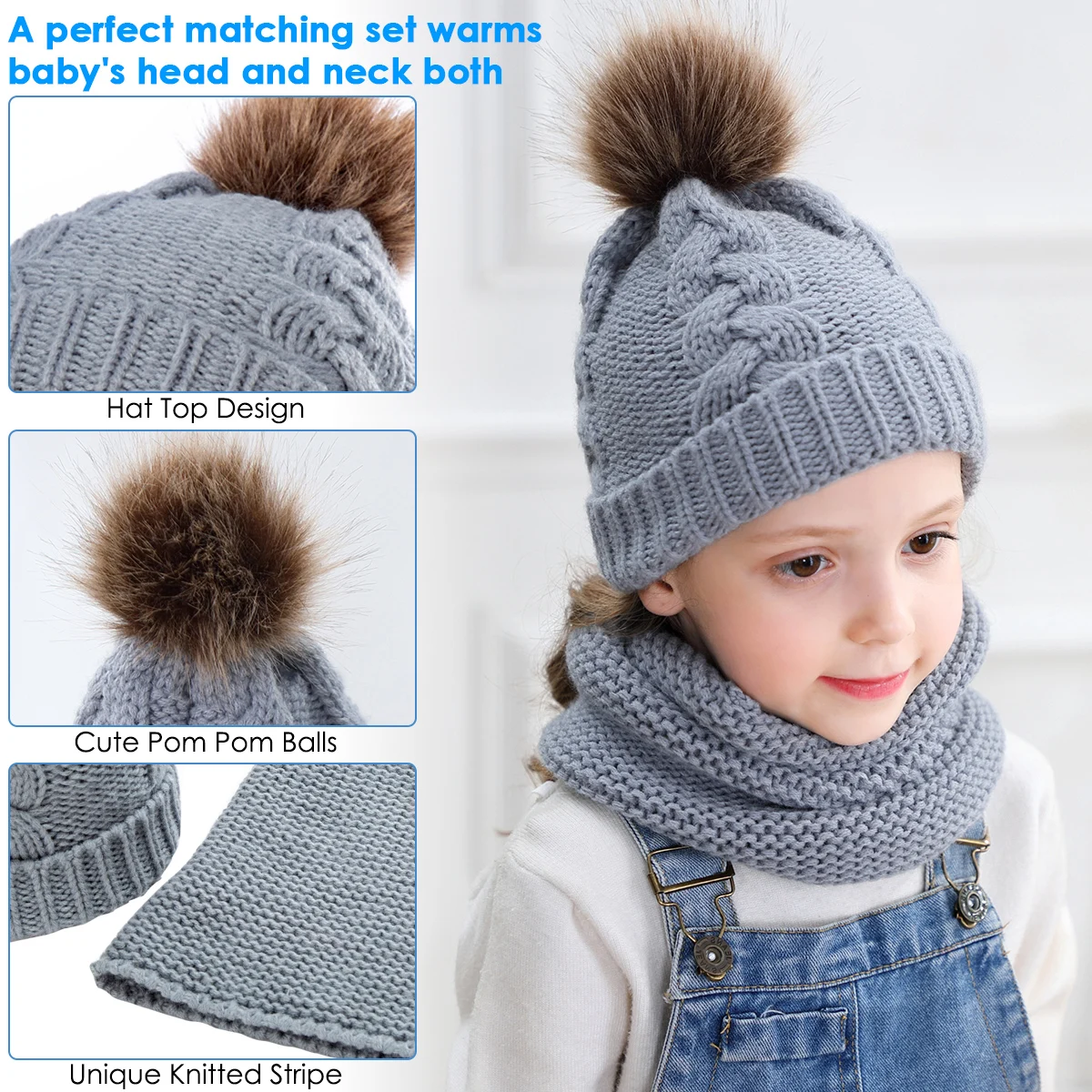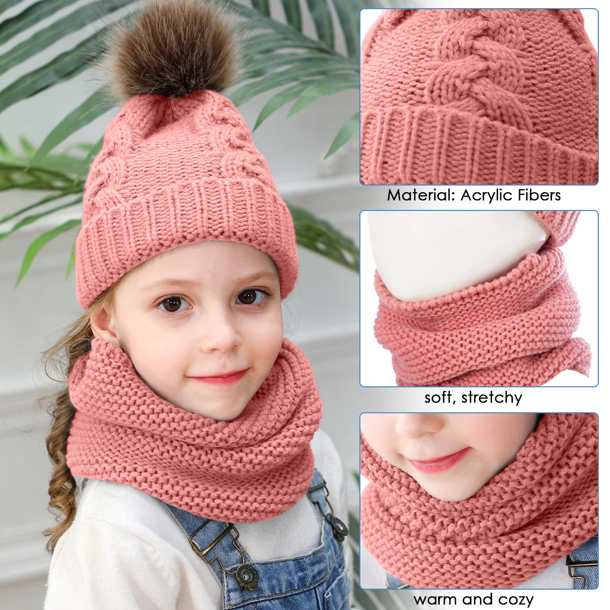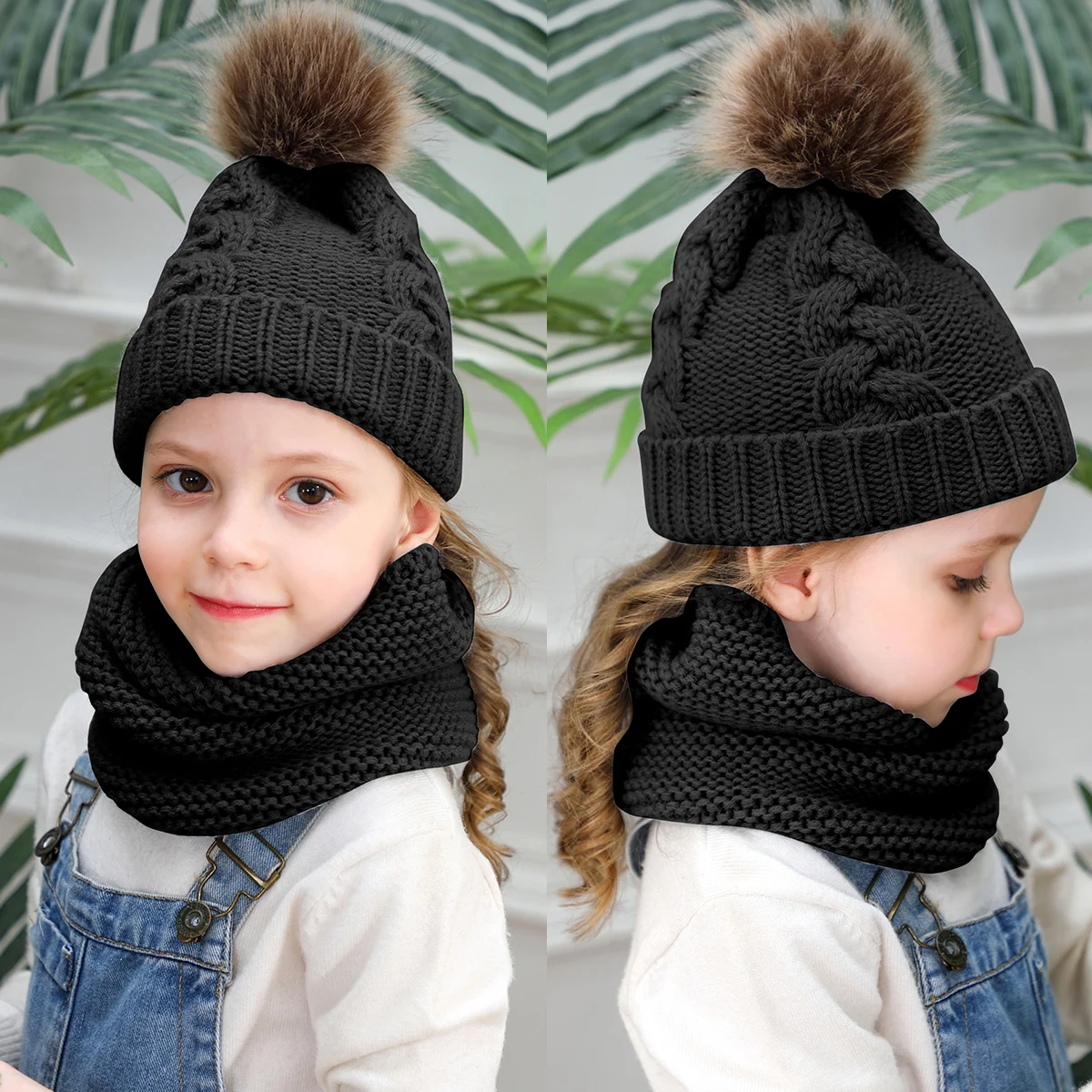 Комплект из 2 предметов для девочек и мальчиков, шапка + шарф, комплект для малышей, детей, зимняя теплая меховая шапка, круглый шарф, Детская вязаная шапка + шарф, сохраняющий тепло