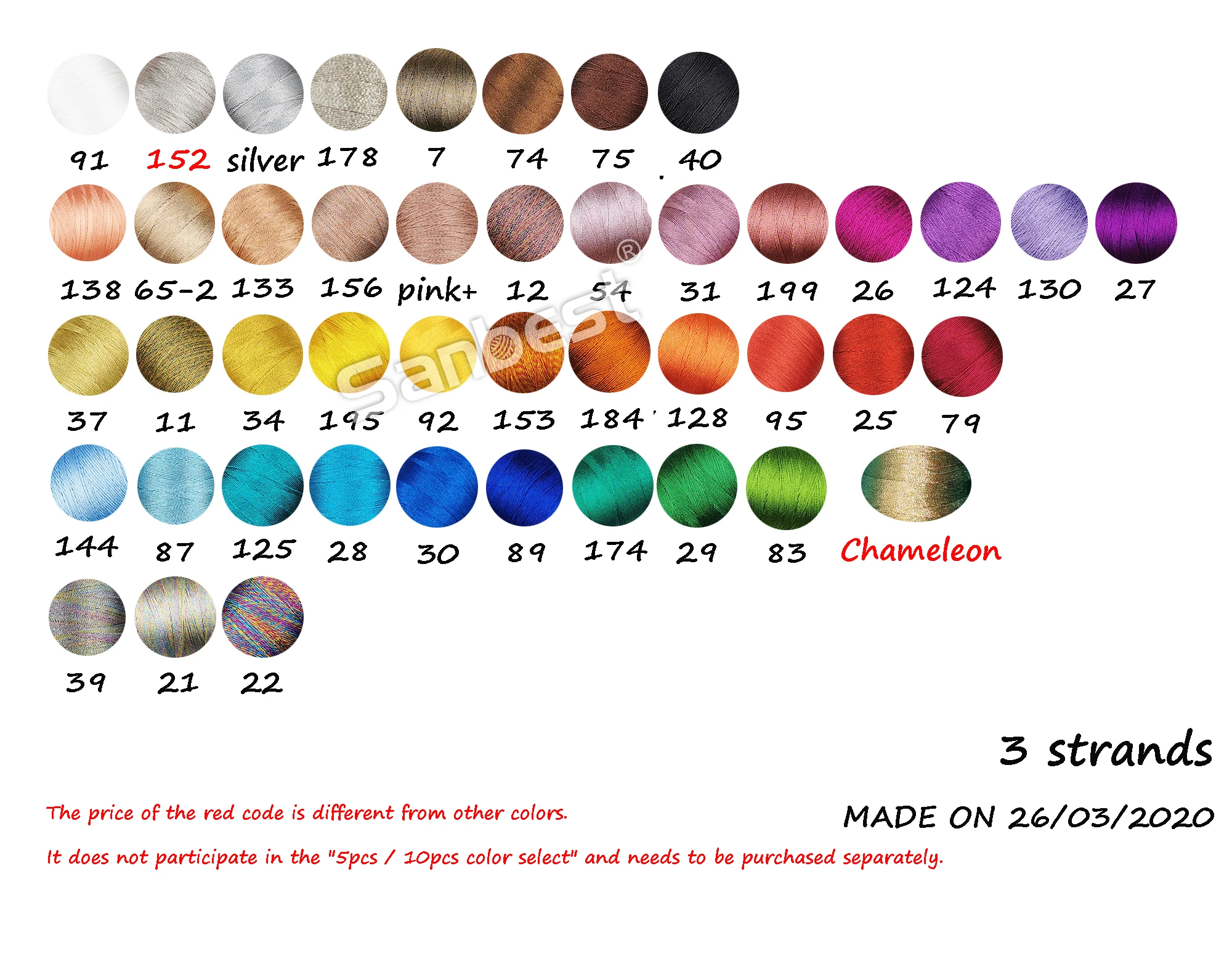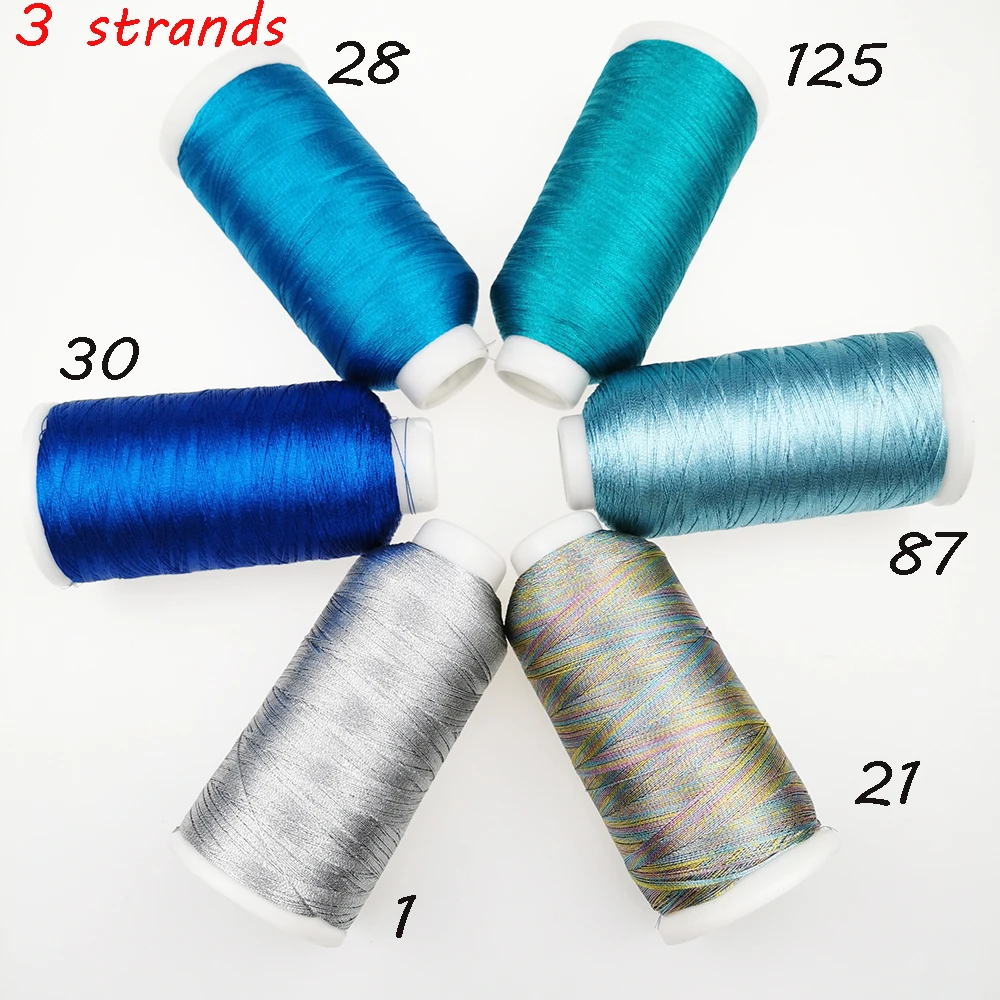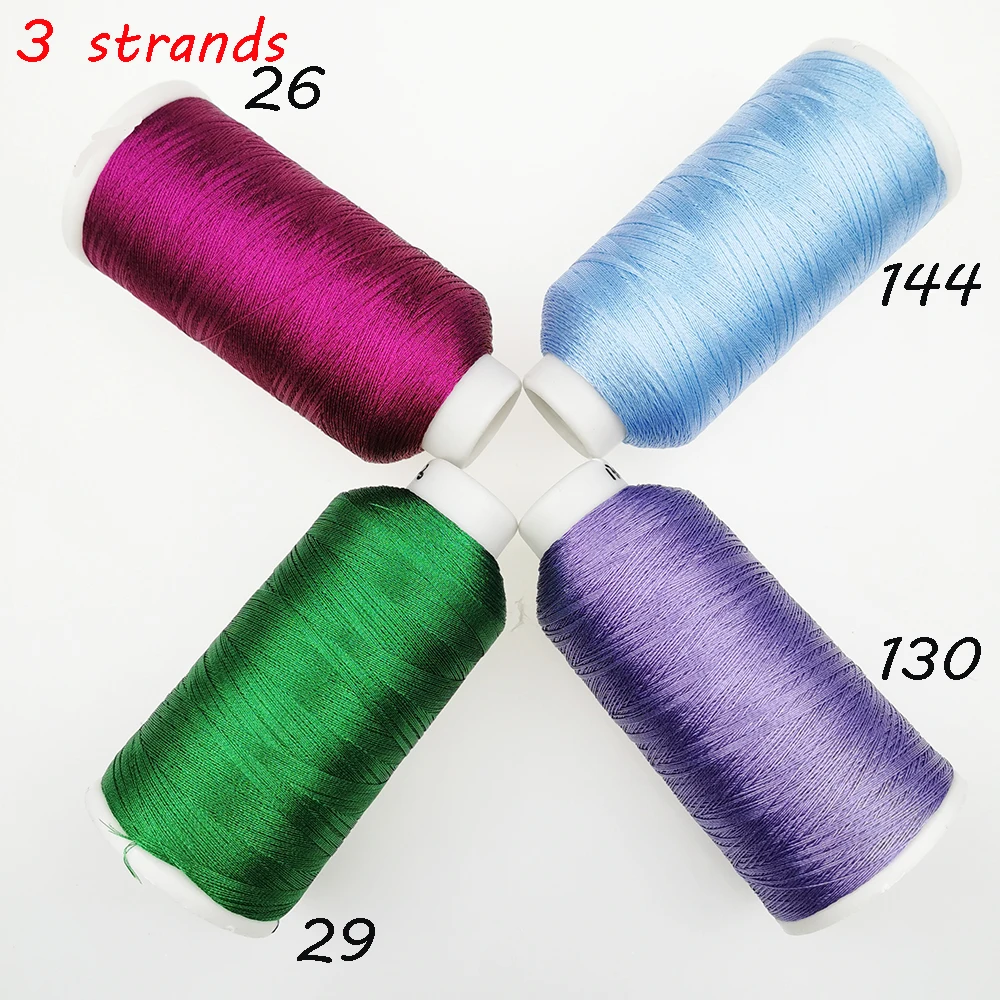 3 пряди составляет около 0,2 мм толщиной и около 1000 метров в длину. 6 нитей составляет около 0,4 мм толщиной и около 500 метров в длину.