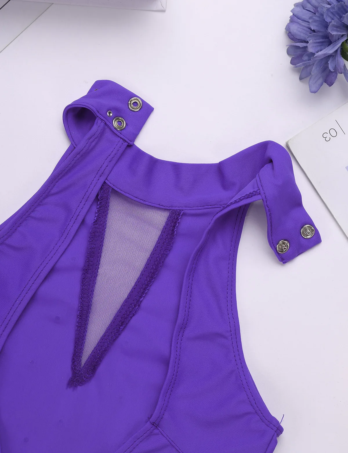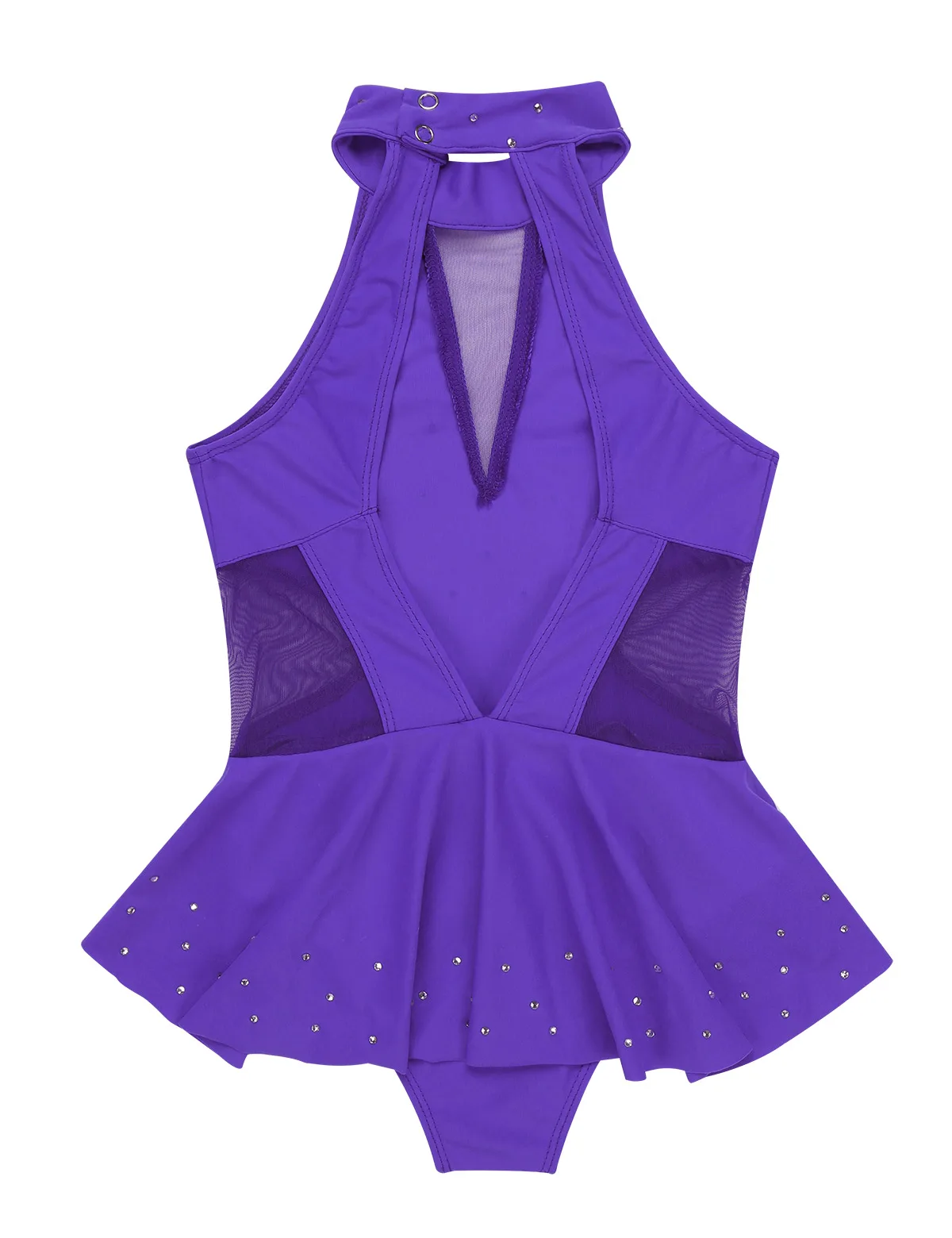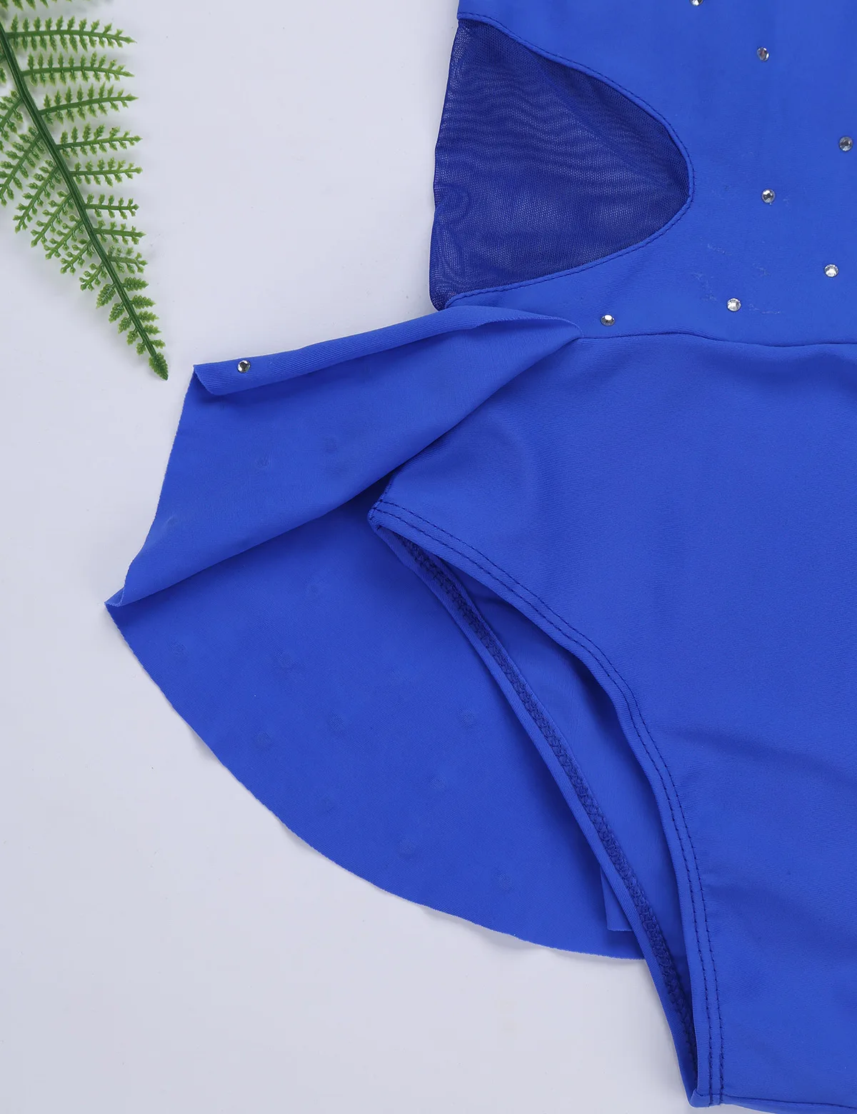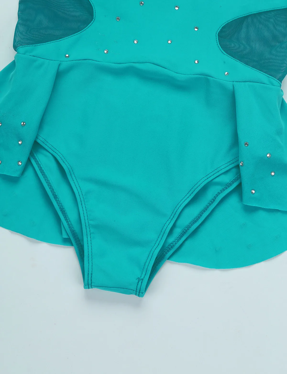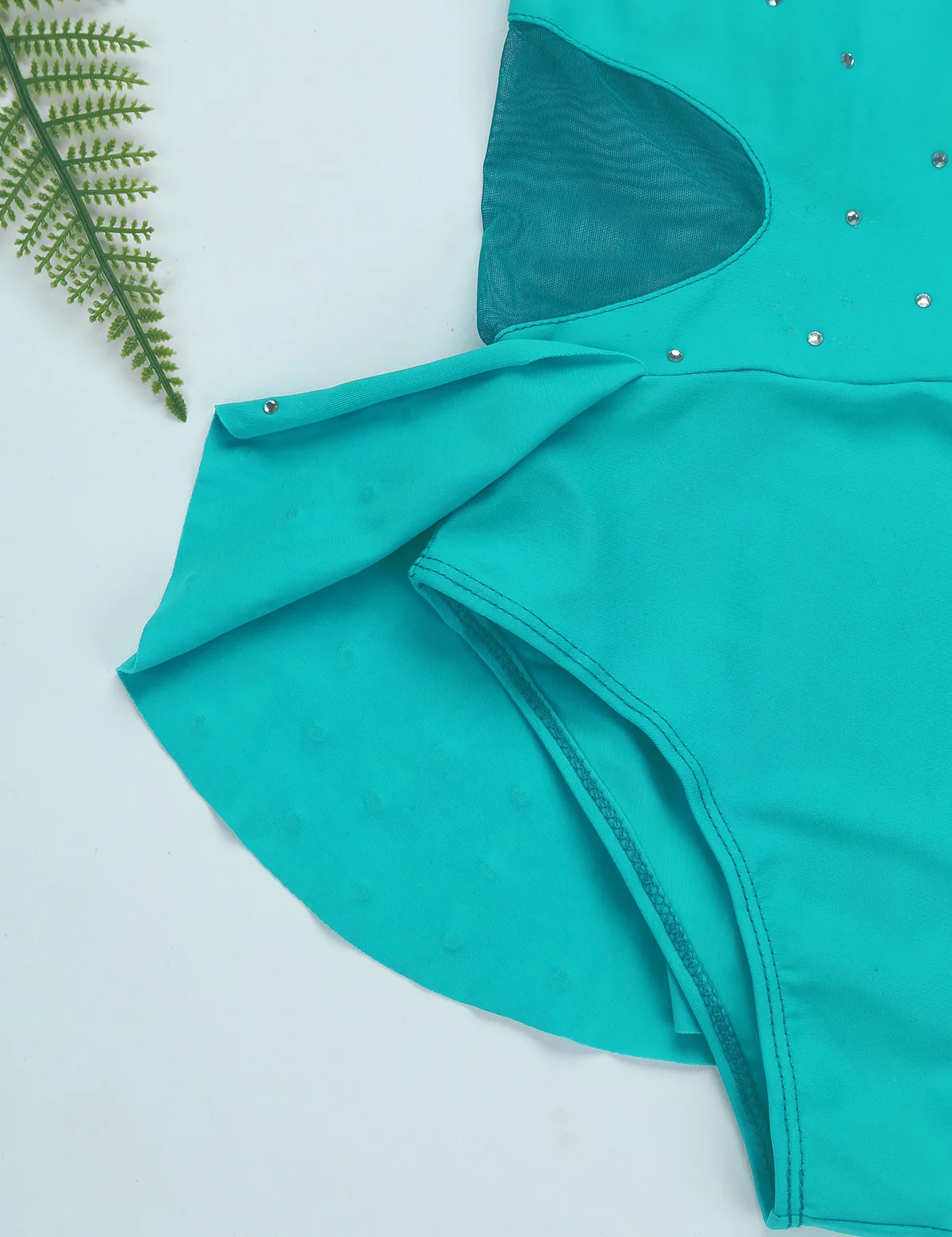 Сетчатая вставка спереди и две стороны талии. 1 слой с рюшами и округлым вырезом на талии сзади. Красивая Одежда для танцев для вашей девочки.