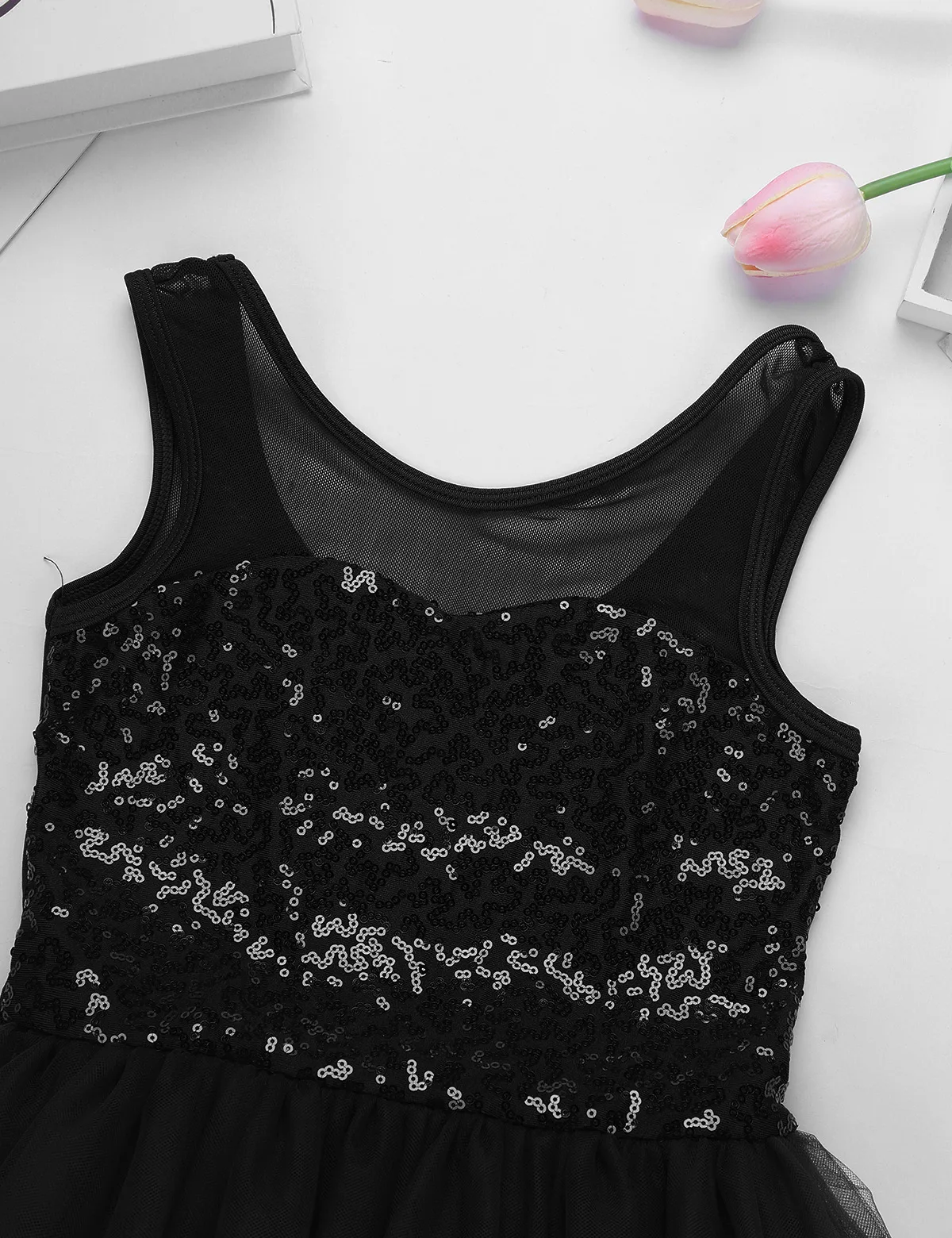 Без рукавов, круглый вырез, милая грудь. Лиф спереди украшен блестящими блестками. Растягивающаяся сетка на передней кокетке и спине.