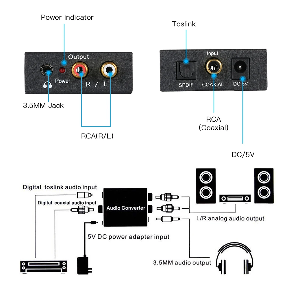 Цифровой 2-полосная аудио конвертер коаксиальный/Toslink аудио конвертер, компактный и удобный. Он принимает вход аудиосигнала S/PDIF через коаксиальный кабель или кабель Toslink и передает сигнал как коаксиальным, так и Toslink выходным портам. Благодаря встроенной функции усиления он также может служить ретранслятором звукового сигнала и увеличивать (двойное) расстояние передачи. Он поддерживает частоту дискретизации 32 44,1, 48 и 96 кГц и преобразовывает коаксиальный или Toslink цифровое аудио вход в аналоговый стерео выход через RCA или 3,5 мм мини-джек.