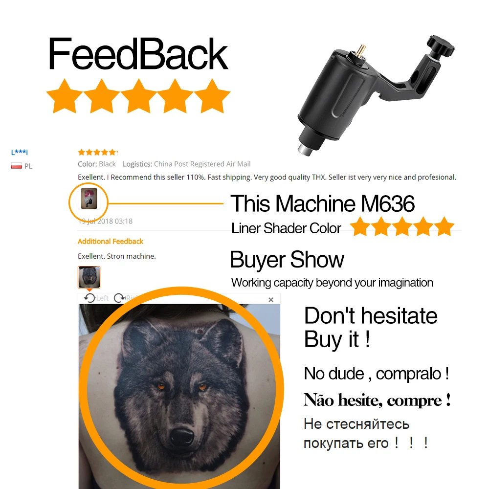 Посылка включает в себя: 1 роторная тату-машина, 1 RCA соединительная линия.