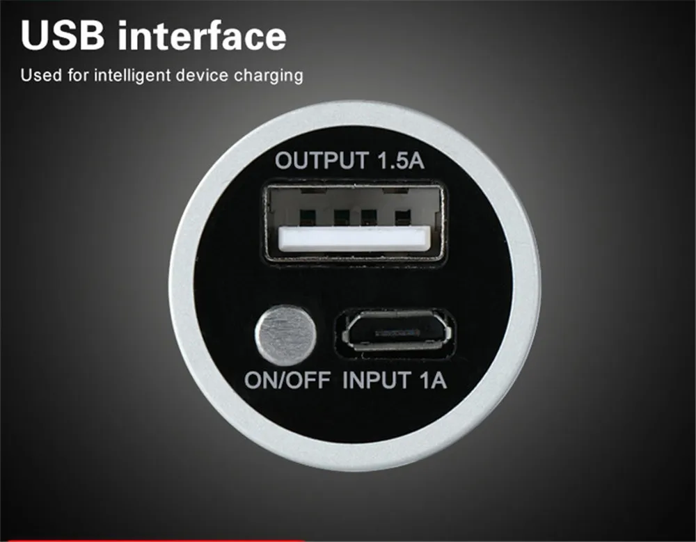 Максимальная яркость: 900 люмен Дальность: 100-200 м Цветовая температура 6000 K Максимальная мощность: 10 Вт Водонепроницаемость: IP46 Ударопрочность: 1 м Длина: 129 мм Размер головки: 27 мм Размер хвоста: 27 мм Вес: 130 г (включая батарею) Цвет: черный, серый Номинальное напряжение: 3,7 в USB Вход: DC 5 В/1A USB Выход: DC 5 В/1.5A Максимальная яркость непрерывное освещение: 300 мин Время перезарядки: 240 минут