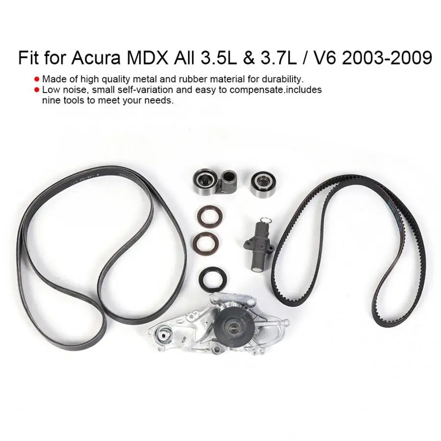 Made of high quality metal and rubber material for durability. Timing belt is an important part of engine valve distribution system. Low noise, small self-variation and easy to compensate. This product includes nine tools to meet your needs. Fit for Acura MDX All 3.5L & 3.7L / V6 2003-2009.