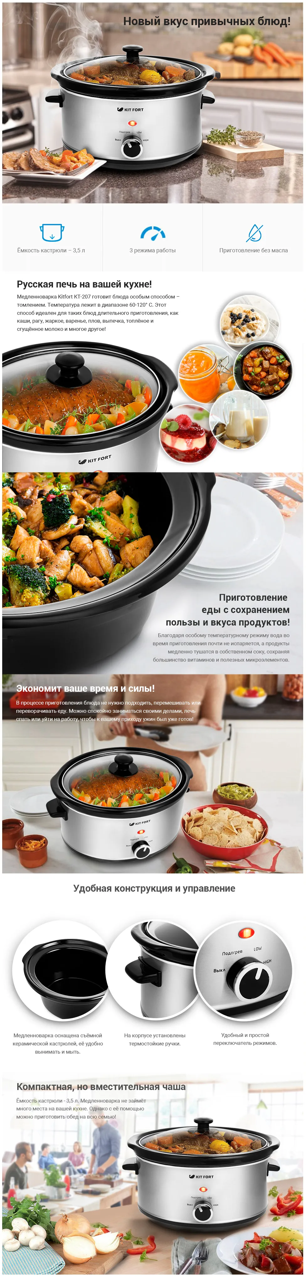 Медленноварка Kitfort КТ-207 is an excellent solution for those who love dish long cooking. This porridge, stew, roast, sauces, jam, топленое milk and ряженка, puddings, and even pies.