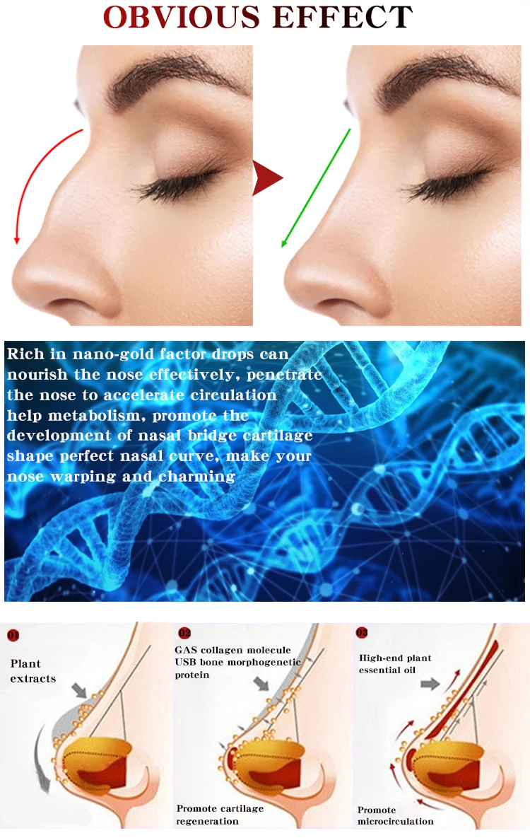 Эфирные масла для похудения носа Анти-против старения-уход за морщинистой кожей, формирующий увлажняющий Восстанавливающий уход за лицом и носом Нано Золотой Нос красивое эфирное масло Вес нетто: 10 мл Особенности: богатый нано-золотым коэффициентом капель может эффективно питать нос, проникает в нос для ускорения циркуляции, способствует метаболизму, способствует развитию мостика носовой хрящи, идеальной формы носовой кривой, сделайте ваш нос деформацией и очаровательным. Состав: Виноград культурный (Виноградный) масло семян, мелалеука ALTERNIFOLIA масло листа (чайное дерево), бертоллетия превосходит семена подсолнечника, гравеоленс Гравитация масло листа, гераниол. Использование: 1. Очищайте лицо теплой водой и сушите. 2. Удаляет 1-2 капли эфирного масла с кольца пальца. 3. Нанесите кольца на пальцы обеих рук вокруг носа, придайте их к мосту носа и Аккуратно помассируйте до тех пор, пока они не будут поглощены.