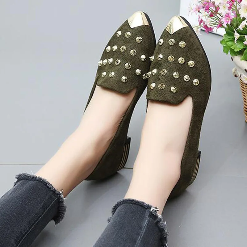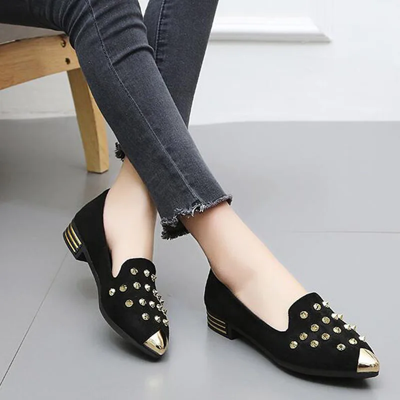 2019 женские туфли с острым носком; Кожаные туфли на плоской подошве обувь для девочек Плоские заклепки; Сезон весна-осень; Пикантная обувь; Женские лоферы на плоской подошве; Дамские туфли на низком каблуке с заклепками