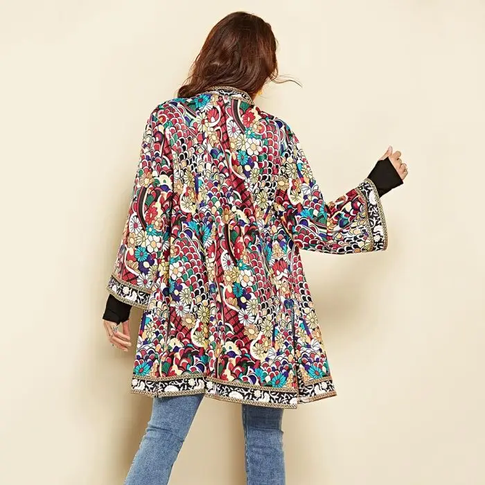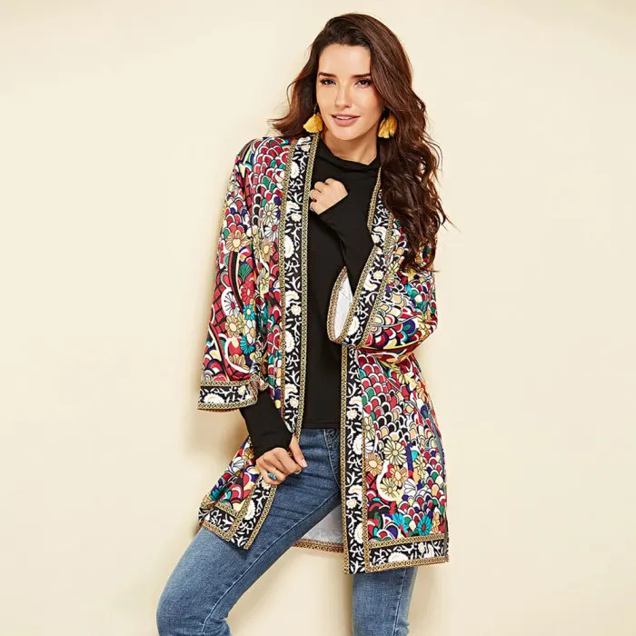 Тип одежды: Женская Осенняя верхняя одежда в этническом стиле с цветочным принтом и длинными рукавами; Куртка в стиле бохо; Кардиганы с запахом