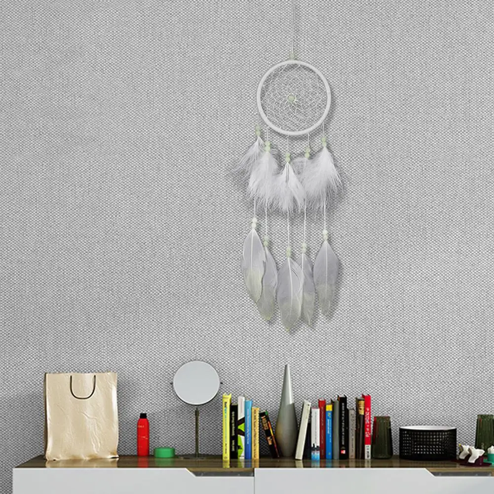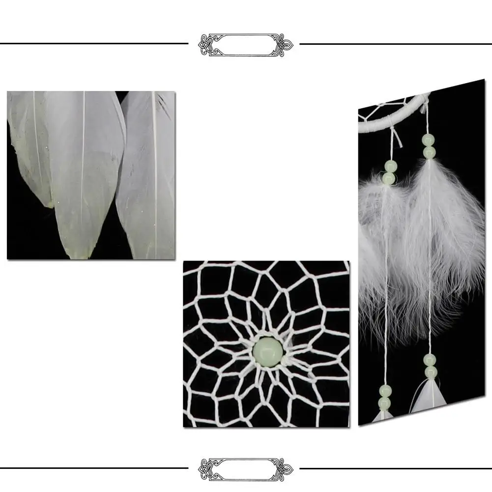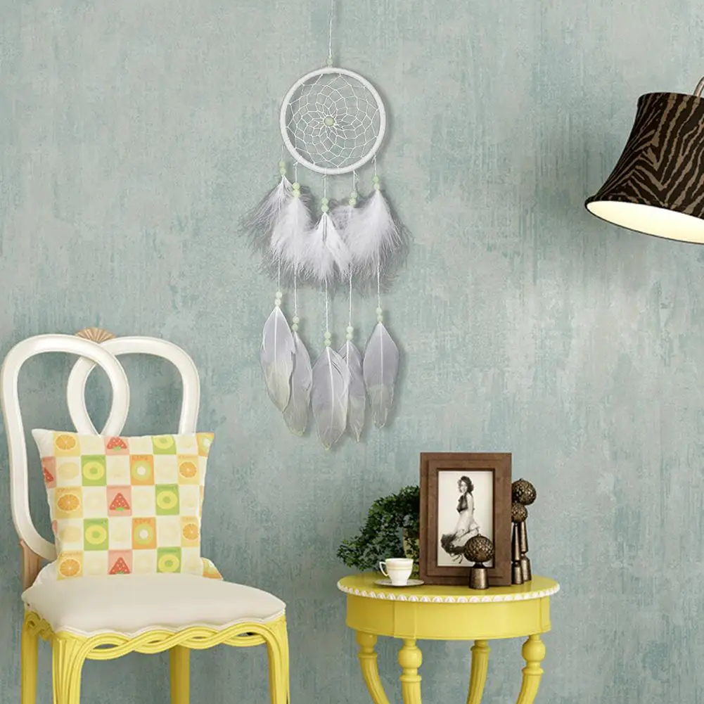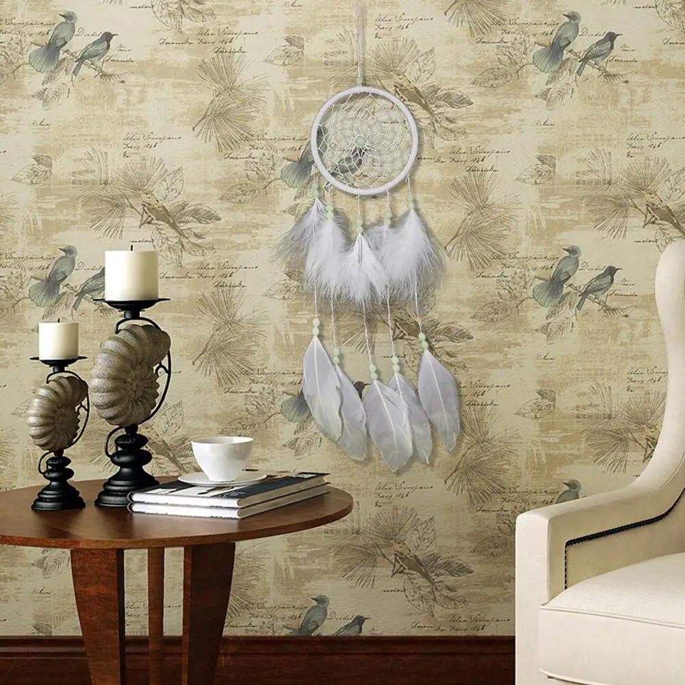 Материал: флокированная ткань, железное кольцо, цветные деревянные бусины, гусиное перо и хлопковые нити