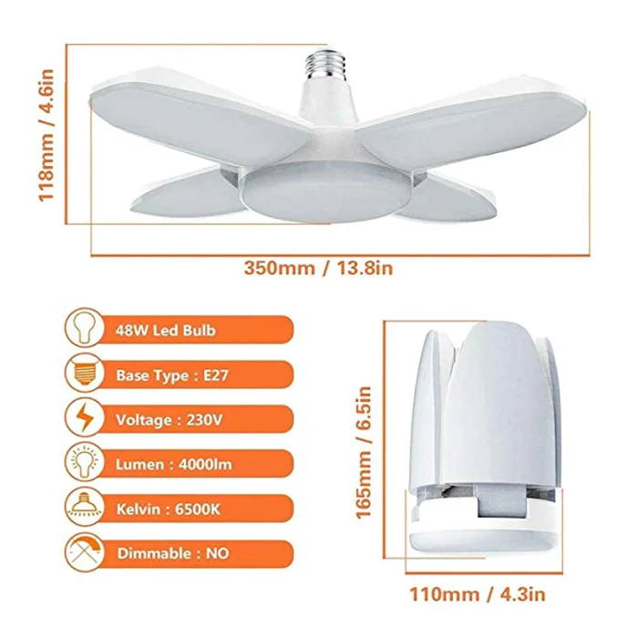 1. Супер яркий и регулируемый дизайн: светодиодный гаражный свет обеспечивает выход 4500 лм при дневном свете 6500K. Имеется одна большая круглая Светодиодная лампа и четыре яркие светодиодные панели с регулируемой высотой вверх, для покрытия более широкой области.