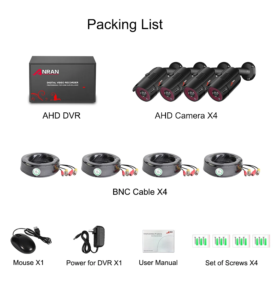 · 1x 4CH AHD DVR · 4x AHD камера · Кабель BNC 4x18 м · 1x1 м сетевой кабель · 1x Питание для DVR · 1x Мышь · 4-кратные винты · 1x Руководство пользователя