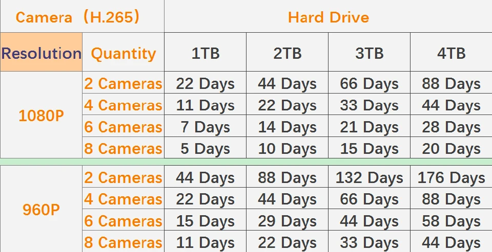 · Когда жесткий диск заполнен, система автоматически удалит самое старое записанное видео, что обеспечивает интеллектуальную циклическую запись. · Данные только для справки, при условии фактического использования.