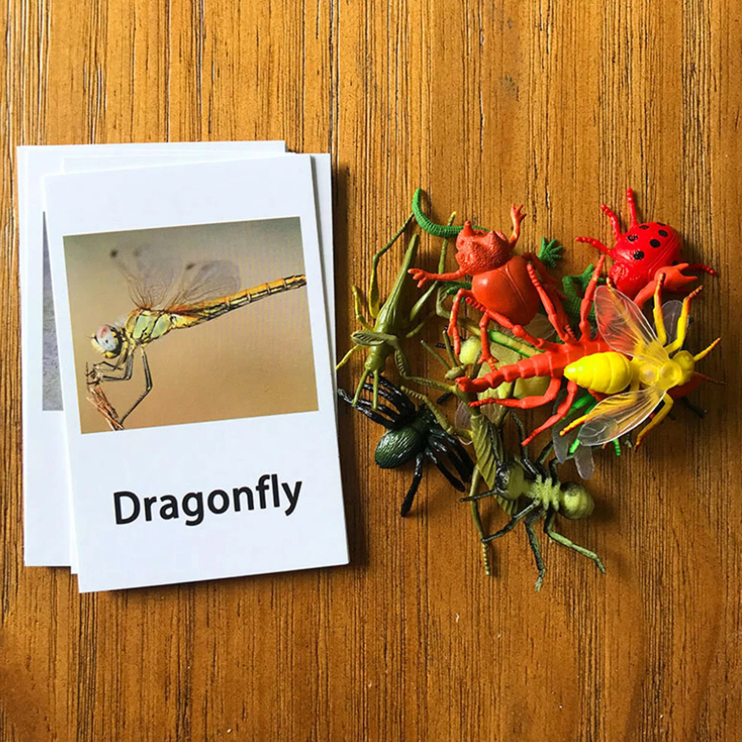 В том числе 12 карт от насекомых и 12 фигурок: стрекоза, геккон, уанг, саранча, божья коровка, Термит, Скорпион, пчела, муха, мантис, паук и муравей, помогает детям практиковаться в распознавании слов, произношении и значениях.