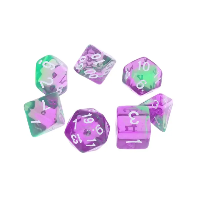 Каждый цвет поставляется с 7 различными игральными костями: 4, 6, 8, 10, 12, 20 двухсторонними игральными костями.