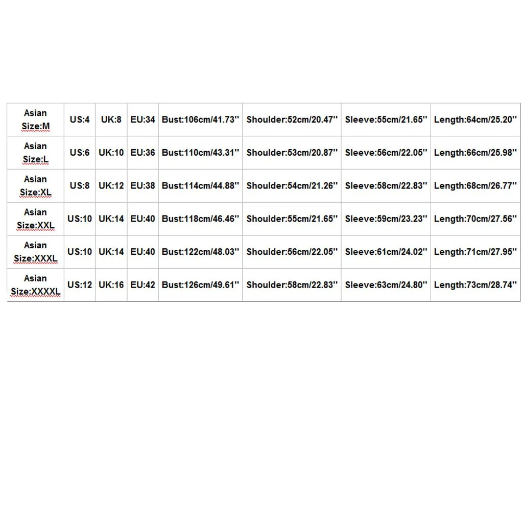 Asian SizeUSUKEUBustShoulderSleeveLengthM4834106cm/41.73''52cm/20.47''55cm/21.65''64cm/25.20''L61036110cm/43.31''53cm/20.87''56cm/22.05''66cm/25.98''XL81238114cm/44.88''54cm/21.26''58cm/22.83''68cm/26.77''XXL101440118cm/46.46''55cm/21.65''59cm/23.23''70cm/27.56''XXXL101440122cm/48.03''56cm/22.05''61cm/24.02''71cm/27.95''XXXXL121642126cm/49.61''58cm/22.83''63cm/24.80''73cm/28.74''