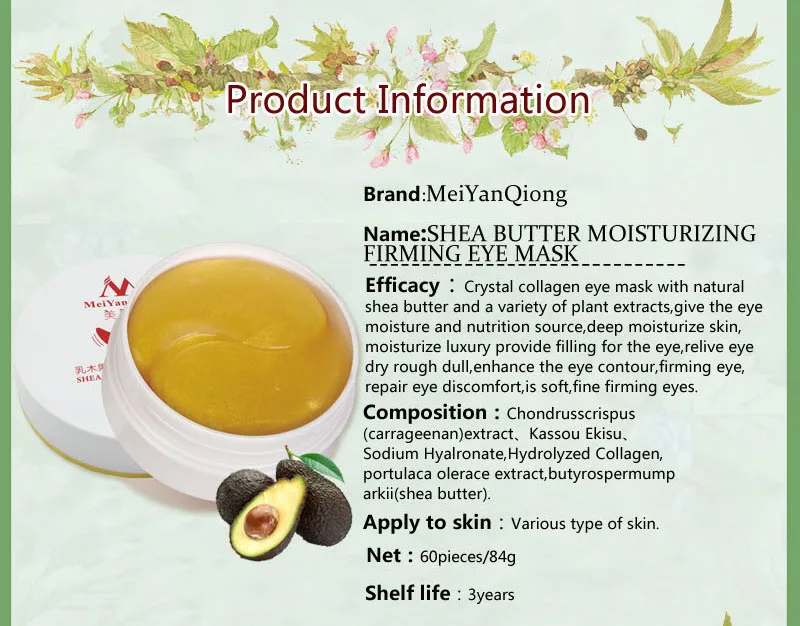 Масло ши увлажняющая укрепляющая золото Коллаген маска для глаз уход за лицом маска для сна патчи для глаз избавляет от темных кругов отбеливание кожи Высококачественное масло ши увлажняющая укрепляющая коллагеновая Золотая маска для глаз Антивозрастной уход для лица пятна избавляет от темных кругов маска для глаз Уход за кожей отбеливание Бренд: MeiYanQiong Название продукта: увлажняющая укрепляющая маска для глаз с маслом ши Сетка: 84 г (60 шт)/коробка Особенности продукта: коллагеновая кристальная маска для глаз, натуральная с экстрактом растений, придает глазу источник влаги и питания, Успокаивающая шлама Ши через кожу, глаза и приносят роскошную пополняющую воду, успокаивает сухую, шероховатый и тусклый глаз, улучшает контур глаз, компактный, улучшает глаза, делает кожу глаз мягкой, гладкой и компактной. Состав: вода, экстракт criкриспа (CARRAGENIN), бутил глюэтил, экстракт карабилена, кассоу экису, глицерин, натрий, феноксиэтанол, EXTRACT экстракт, bulbulбулколет, Олимп, гидрогенный Кастор Срок годности: 3 года Для кожи: все типы кожи могут использоваться Способ использования: после очистки маски, прикрепленной к глазу, подождите 15-20 минут позже, оставшаяся эссенция поглощает массаж глаз.
