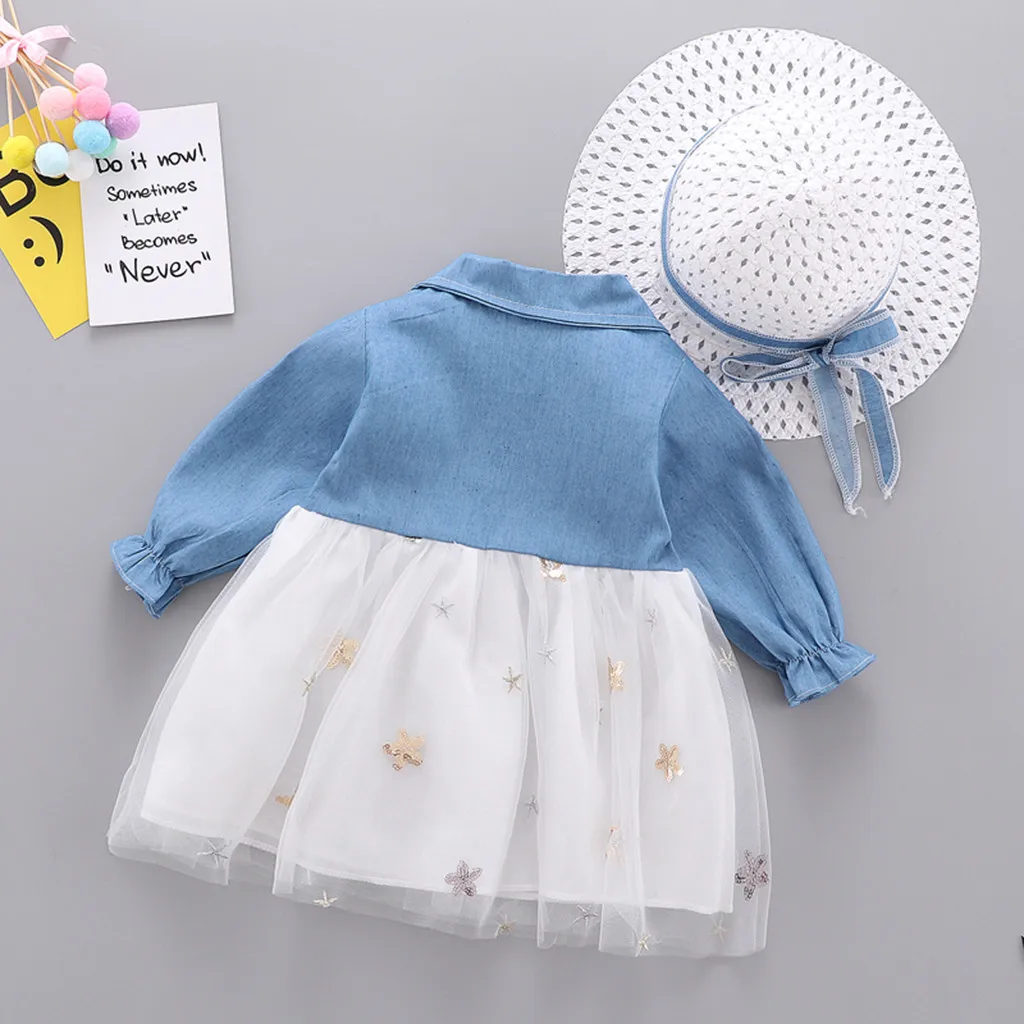 Джинсовое платье принцессы из тюля с длинными рукавами и звездами для маленьких девочек + шапочкаСтильC)