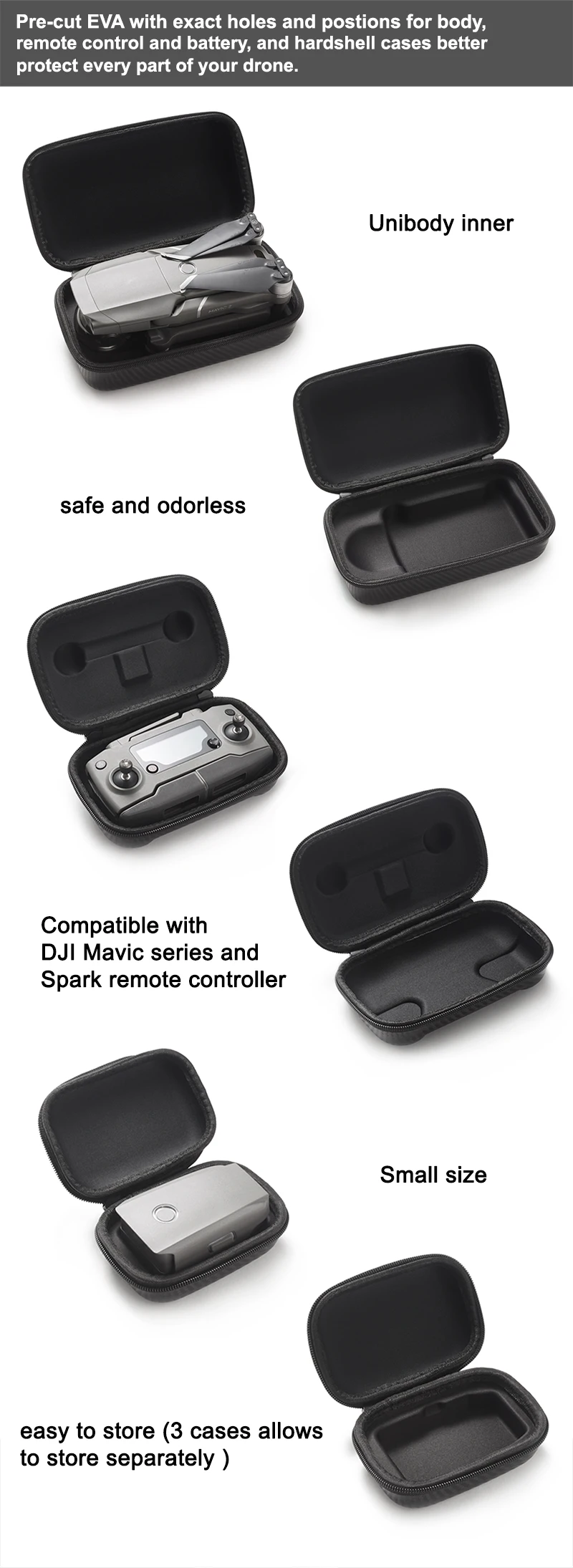 Легко носить на открытом воздухе Защитите свой DJI Mavic 2 от царапин и ударов Ударопрочный с внутренней подкладкой из ЭВА Легкий доступ к дрону с застежкой-молнией С Ручным ремешком, вы можете легко носить ваш Дрон Подходит для корпуса дрона Mavic 2 и пульта дистанционного управления Размеры и вес: 220*120*90 мм; 180 г (для корпуса дрона) Размеры и вес: 165*100*68 мм; 120 г (для пульта дистанционного управления) Цвета: черный Посылка включает в себя: Чехол для дрона Mavic 2 pro/Zoom, 1 шт. Чехол для аккумулятора дрона Mavic 2 pro/Zoom, 1 шт. Чехол для пульта дистанционного управления Mavic 2 pro/Zoom, 1 шт. Примечание: Дрон, контроллер и другие аксессуары в комплект не входят, только для справки