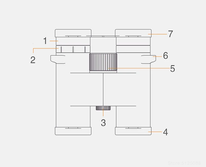 1. Поворотная маска для глаз 2. Правый окуляр фокусирующий маховик 3. Нижняя крышка 4. Объективы 5. Маховик с центральным фокусом 6. Пряжка 7. Окуляр