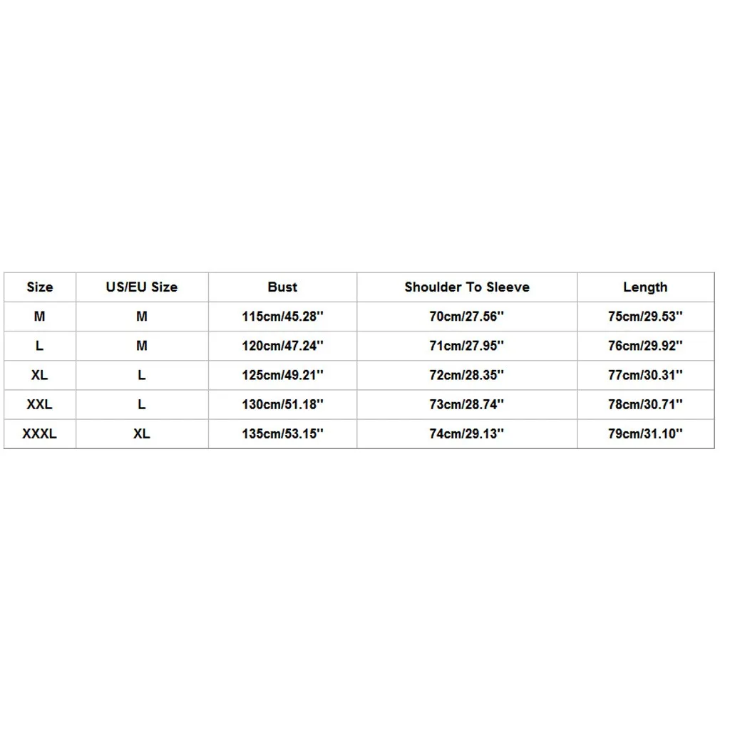 РазмерРазмер США/ЕСБюстОт плеча до рукаваДлинаММ115 см/45,28''70 см/27,56''75 см/29,53''LМ120 см/47,24''71 см/27,95''76 см/29,92''XLL125 см/49,21''72 см/28,35''77 см/30,31''XXLL130 см/51,18''73 см/28,74''78 см/30,71''XXXLXL135 см/53,15''74 см/29,13''79 см/31,10''