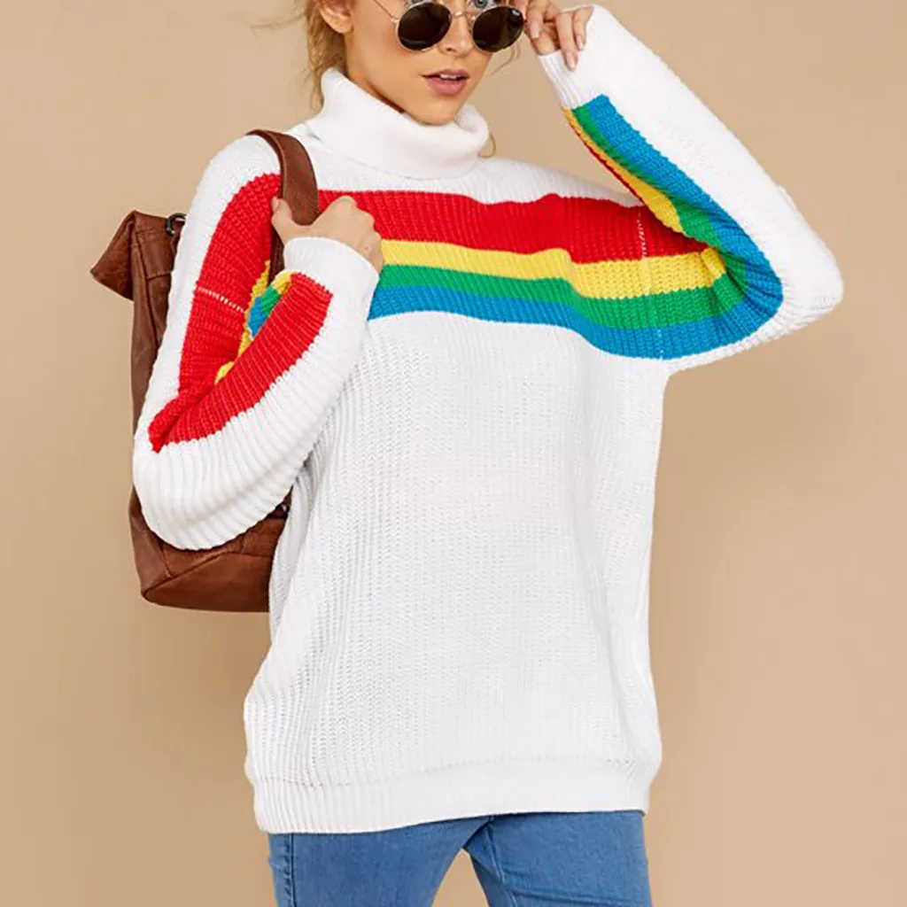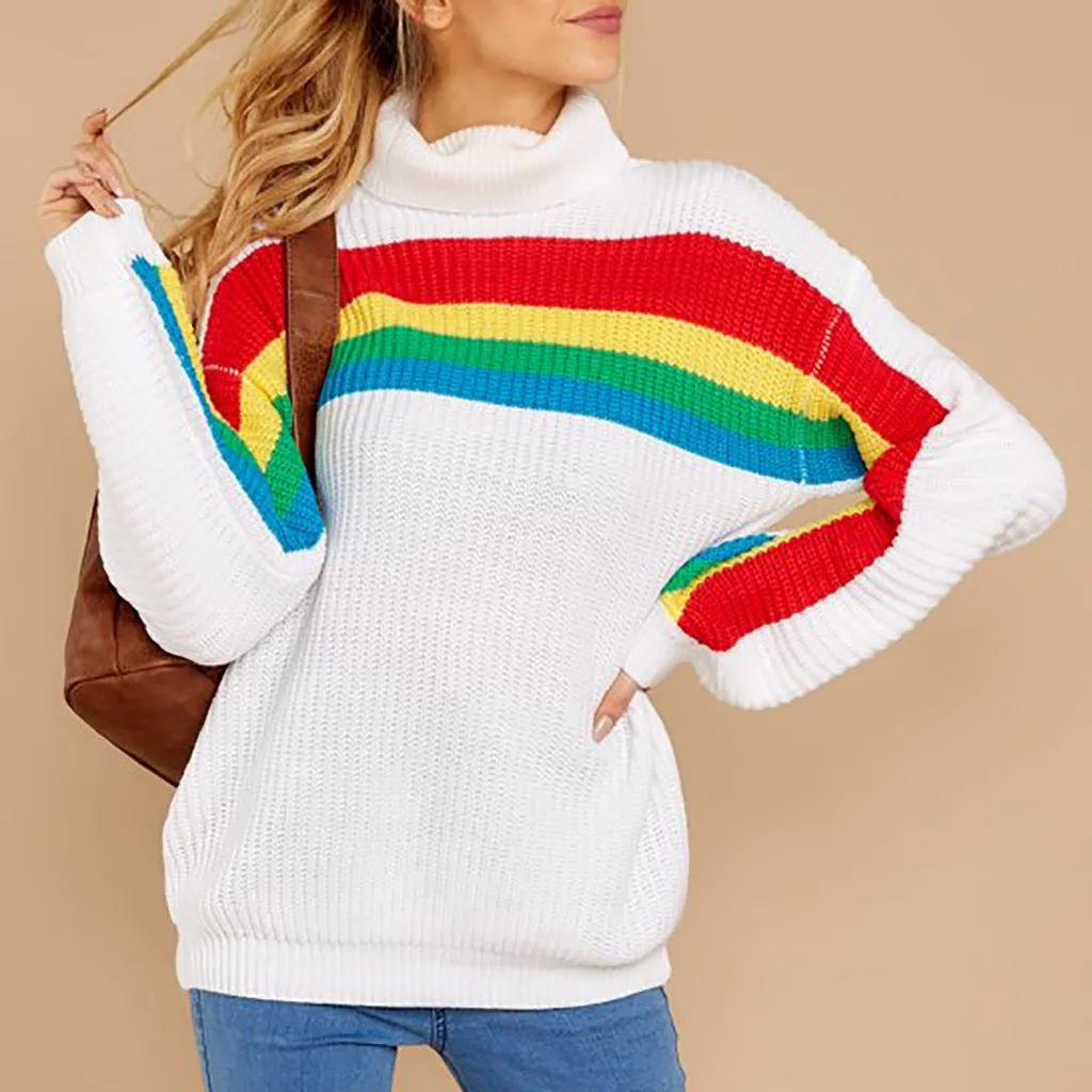 Женский трикотажный свитер с длинным рукавом в полоску радужной расцветки с v-образным вырезом