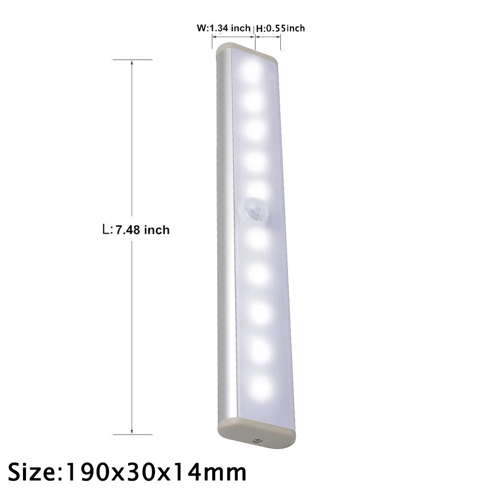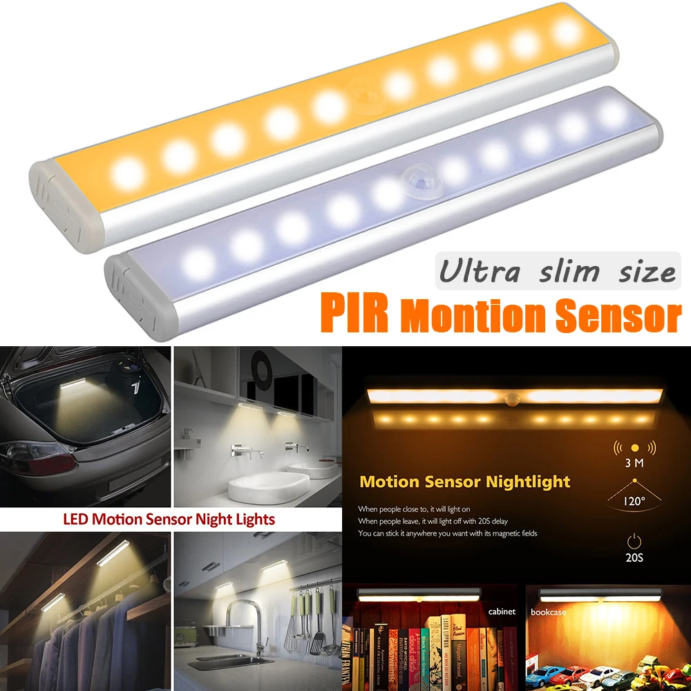 PIR Motion Sensor LED Cabinet light 10LEDs Ultra Slim Portable Wall lamp Rigid Strip Bar Light for Cupboard Kitchen Wardrobe