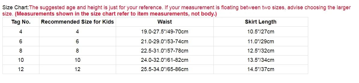Бирка № Рекомендуемый размер для детей Талия Длина юбки 4 4 19,0-27,5 "/49-70 см 10,5 "/27 см 6 6 21,0-29,0 "/53-74 см 11,0 "/29 см 8 8 22,5-31,0 "/57-78 см 12,5 "/32 см 10 10 24,0-32,0 "/61-82 см 13,5 "/34 см 12 12 25,5-34,0 "/65-86 см 14,5 "/37 смПолезные советы: Замеры делаются вручную, поэтому учитывайте небольшие погрешности. Цвет на фото может немного отличаться от реального товара из-за особенностей цветопередачи различных мониторов.