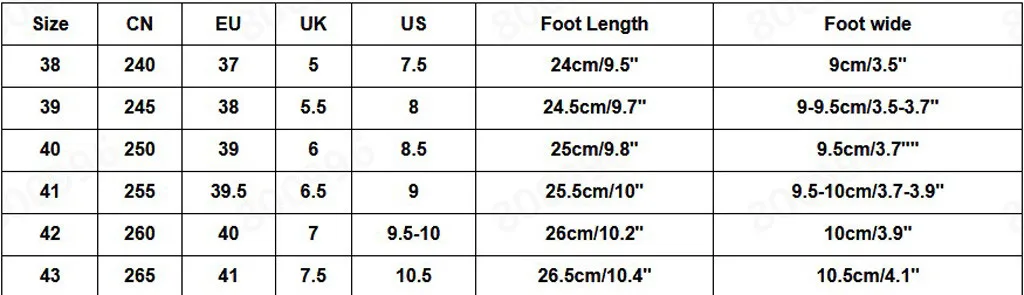 Размер CN ЕС Великобритания Свяжитесь с нами Foot Длина При покупке обувь на широкую ногу 38 240 37 5 7,5 24 см/9,5" 9 см/3,5" 39 245 38 5,5 8 24,5 см/9,7" 9-9,5 см/3,5-3,7" 40 250 39 6 8,5 25 см/9,8" 9,5 см/3,7 "" 41 255 39,5 6,5 9 25,5 см/10" 9,5-; высотка каблука 10 см/3,7-3,9" 42 260 40 7 9,5-10 26 см/10,2" Высота каблука 10 см/3,9" 43 265 41 7,5 10,5 26,5 см/10,4" 10,5 см/4,1"