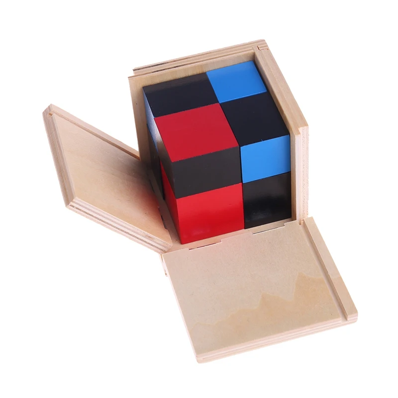 Факторы уравнения представлены цветными кубиками и призмами. Дети младшего возраста могут изучить биномиальный куб в качестве чувствительной активности визуального различия цвета и формы. Это может служить в качестве непрямой подготовки к алгебре и математике