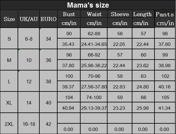 Мама Размер Евро Размер Великобритания/AU Размер Бюст Талия рукав Длина топа Длина брюк