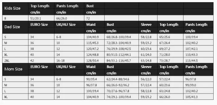 Размер для папы; Европейский размер; Размер Великобритании/Австралии; Обхват груди; Обхват талии; Длина топа; Длина брюк