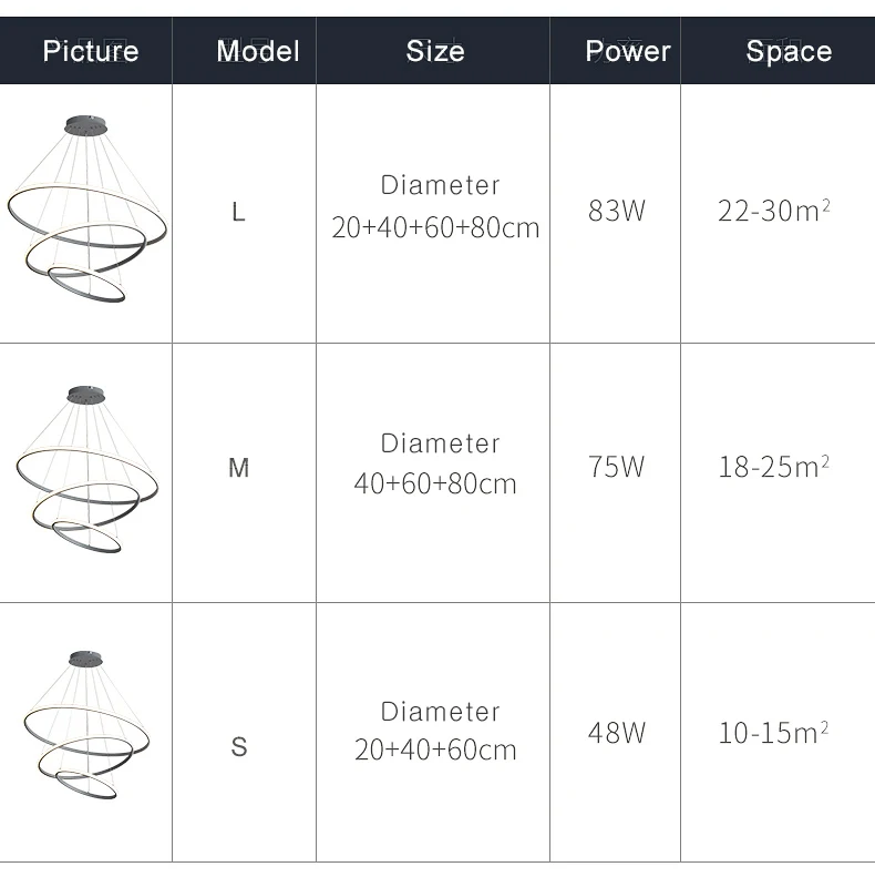 S Dia20 + 40 + 60 см, подходит для 8-15 ㎡. Небольшое пространство комнаты, как столовая, кабинет. M Dia40 + 60 + 80 см, подходит для 12-25 ㎡. Среднее пространство, как столовая, гостиная, офис. L Dia20 + 40 + 60 + 80 см, подходит для 18-30 ㎡. Большое пространство комнаты как гостиная, столовая, офис.