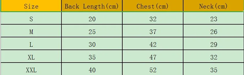 1. Ручные измерения могут иметь погрешность 2-3 см. 2. Одежда для обеих ног, пожалуйста, обратите внимание на периметр грудной клетки, и на четыре ноги, она должна соответствовать грудному периметру и длине спины. 3. Для растущего щенка лучше выбрать больший размер.