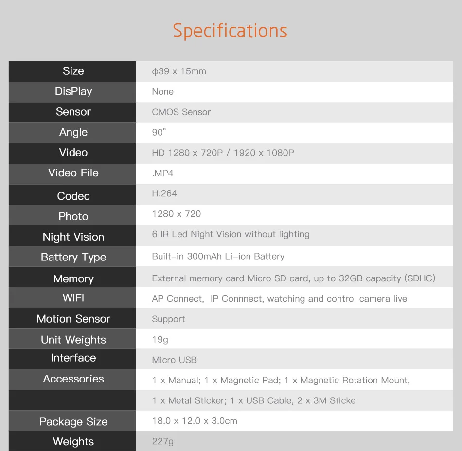 Размер (прибл.): 40x15,9 мм/1,57 * 0.63in Экран: нет Датчик изображения: датчик CMOS Угол обзора: 90 градусов Разрешение видео: HD 1280x720 P Формат видео: MP4 Формат сжатия: H.264 Разрешение фото: 1280x720 Инфракрасное Ночное Видение: 6 световых инфракрасных огней ночного видения Тип батареи: встроенный литий-полимерный аккумулятор 220 мА Хранение: внешняя Подключаемая карта, максимальная поддержка 32 ГБ Micro SD карта TF Wi-Fi подключение: AP локальное подключение, IP Дистанционное подключение, wifi беспроводной контроль видео камера Обнаружение движения: Поддержка Вес нетто: около 19 г Интерфейс: Micro-USB Размер упаковки: около 18,0x12,0x3,0 см/7,09*4,72*1,18 дюйма Вес брутто: около 227 г