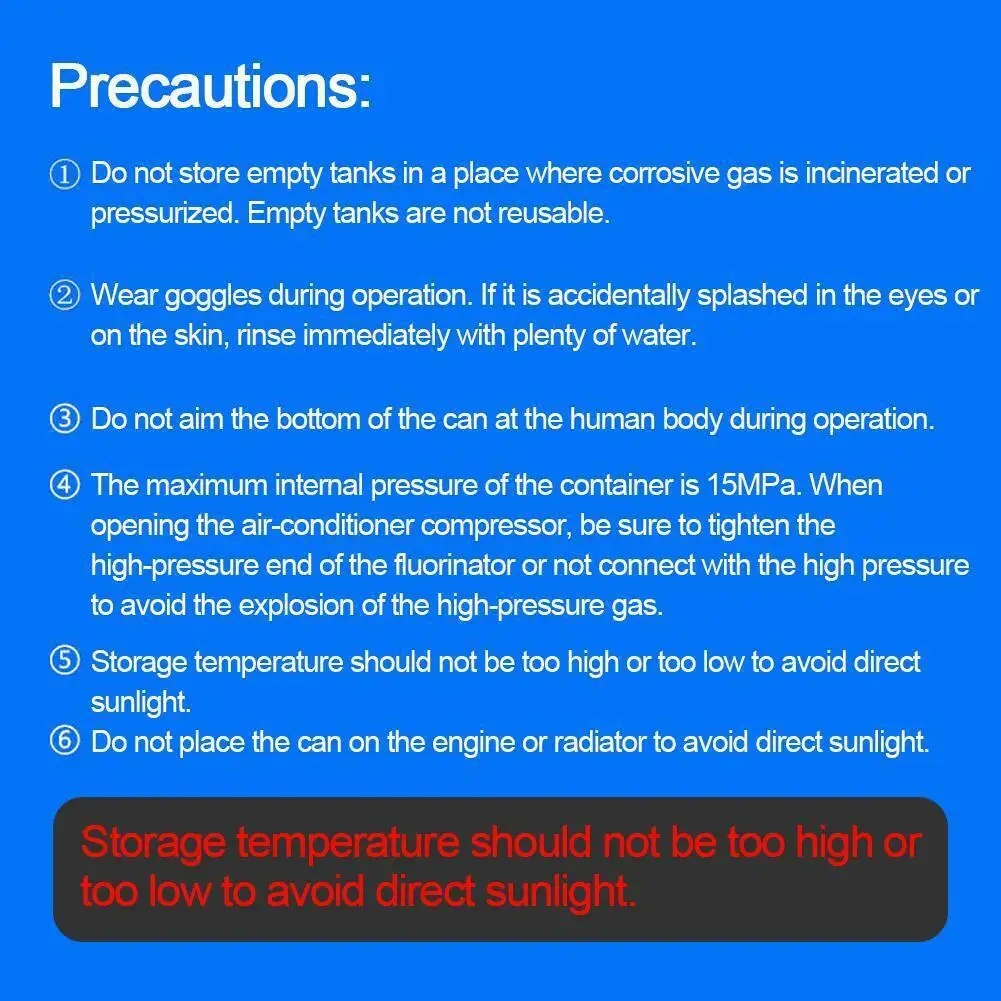 4. Максимальное внутреннее давление контейнера составляет 15 МПа. При открытии компрессора кондиционера Обязательно затяните конец фторирующего устройства высокого давления или не подсоедините его к высокому давлению, чтобы избежать взрыва газа высокого давления.