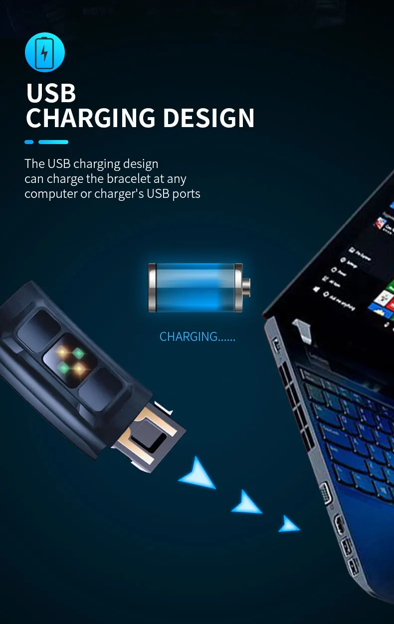 В сети usb-кабель для зарядки Можно заряжать браслет в любое время Usb-порты компьютера или зарядного устройства