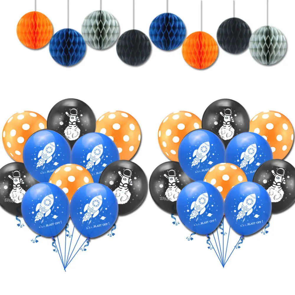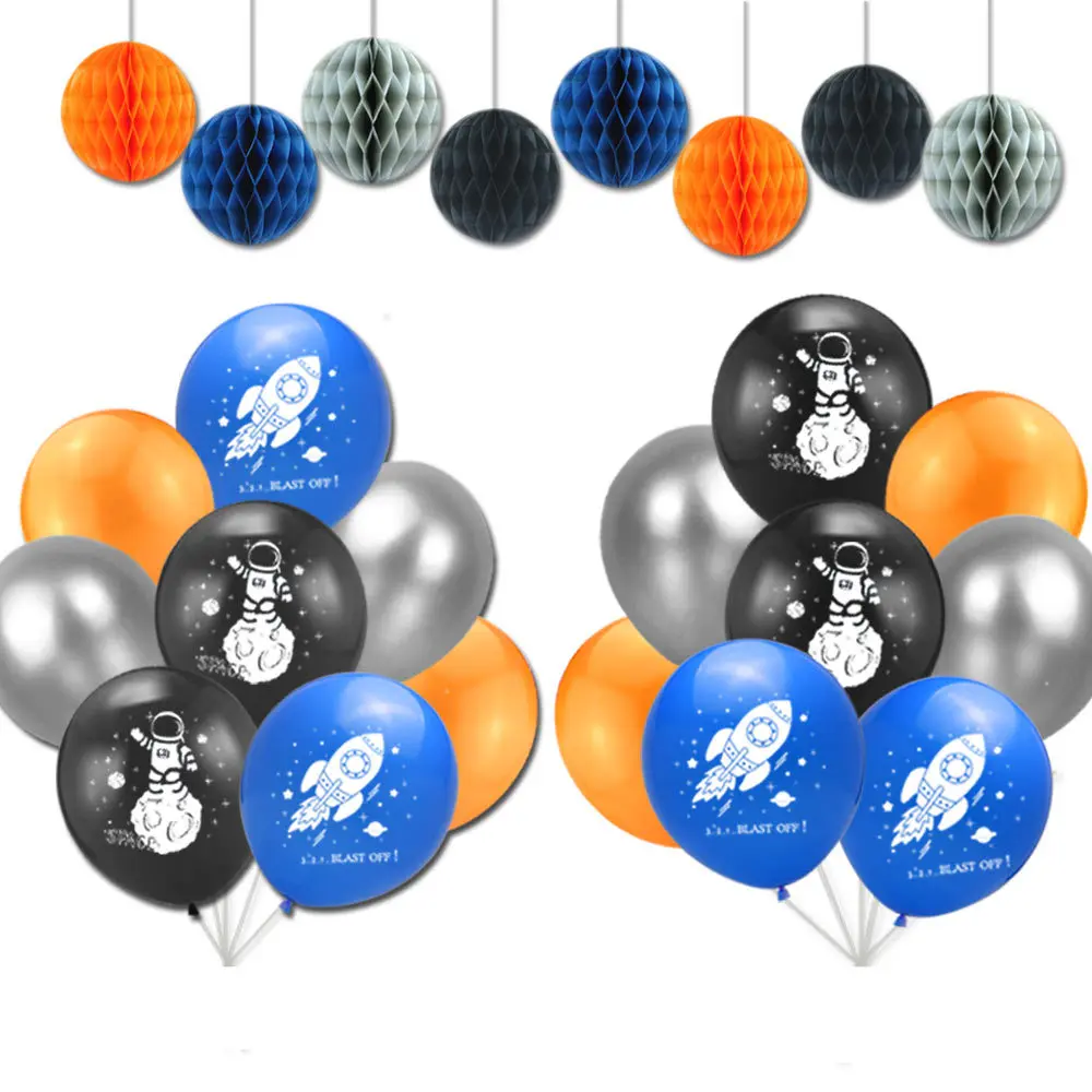 Комплект B: 8 ракеты + 6 космонавтов + 6 волн + 8 сотовых шаров + 15 кисточек (18x15x3,5 см 234 г)
