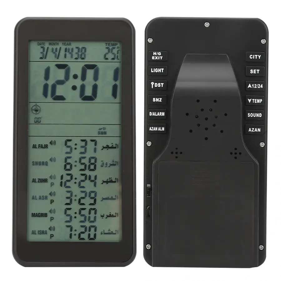 Время азана доступно в крупных городах по всему миру, в общей сложности 2000 города доступны, Может отображать текущее время, дату, неделю и функцию отображения Gregorian calendar, функцию world time. С функцией воспроизведения музыки и сигнализации MAKKAH pray (одна сигнализация/велосипедная сигнализация). Погрешность каждой группы времени молитвы может быть скорректирована, и каждая группа времени молитвы может выключаться по желанию. Функция температуры: он может переключаться между Цельсия и фаренгейтом. Функция сохранения дневного света (DST), 12/24 почасовая система. Светодиодный экран с подсветкой помогает просматривать в темноте. Регулятор уровня громкости, очень удобный. Используйте международный код телефонной зоны, чтобы найти город, удобный и быстрыйТип батареи: 4 шт. AA (без)