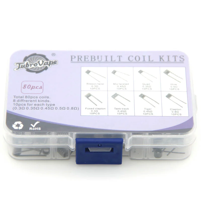 Комплекты готовых катушек Материал: КА1 Описание продукта: Комплект катушек 1*8 в 1 (В каждой коробке 80 шт. катушек) Количество параметров сопротивления названия Скрутка ленты 0.3ом 0,2*0,8 плоская * 2 10 Микс витой 0.45ом 0,2*0,8 плоский + 26GA 10 Четырехъядерный 0,35 Ом 28GA * 4 10 Улей 0.5ом 30GA * 2 10 Плавленый CLAPTON 0,3 Ом 26*2 + 38 10 Гусеница резервуара 0.45ом 0,3*0,8 плоская + 32GA 10 TIGER 0.45ohm 0,2*0,8 плоский + 26GA 10 CLAPTON 0.8ohm 26GA * 30GA 10