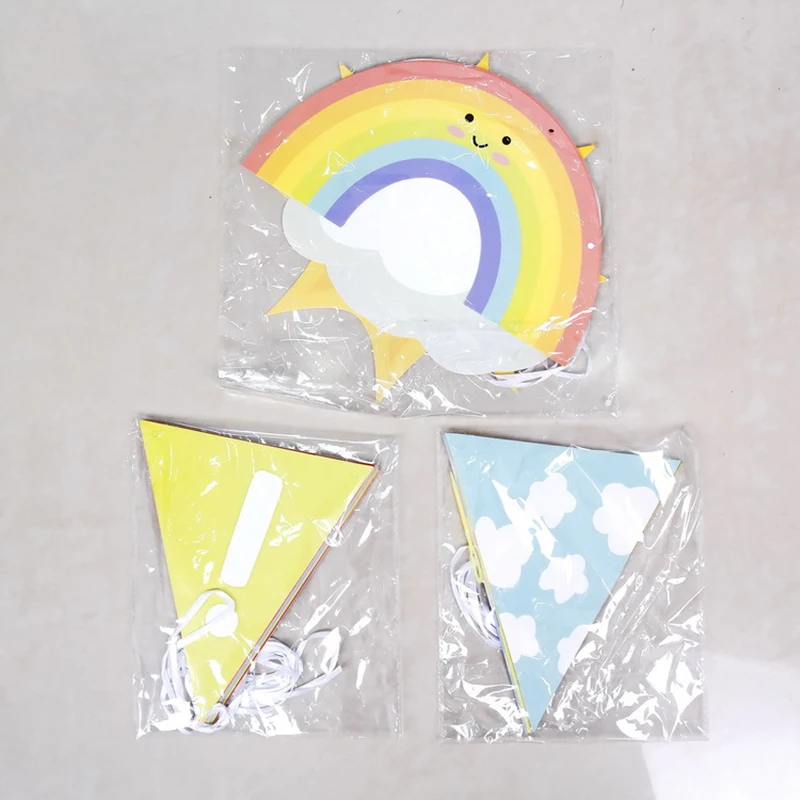 Размеры: Вымпел: 17*14 см (0.56ft длина, 0.46ft ширина) Радуга: 23*13 см (длина 0.75ft, ширина 0.43ft) Солнце: 22,5*22,5 см (длина 0.74ft, ширина 0.74ft) Облако: 20*15 см (0.66ft длина, 0.49ft ширина) Вес: 122 г Материал: бумага