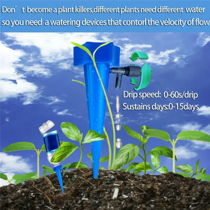Капельное контроллер:Вода будет медленно излучается через устройство в течение 15 дней, автоматически поливая ваши растения. Скорость капель зависит от вас.