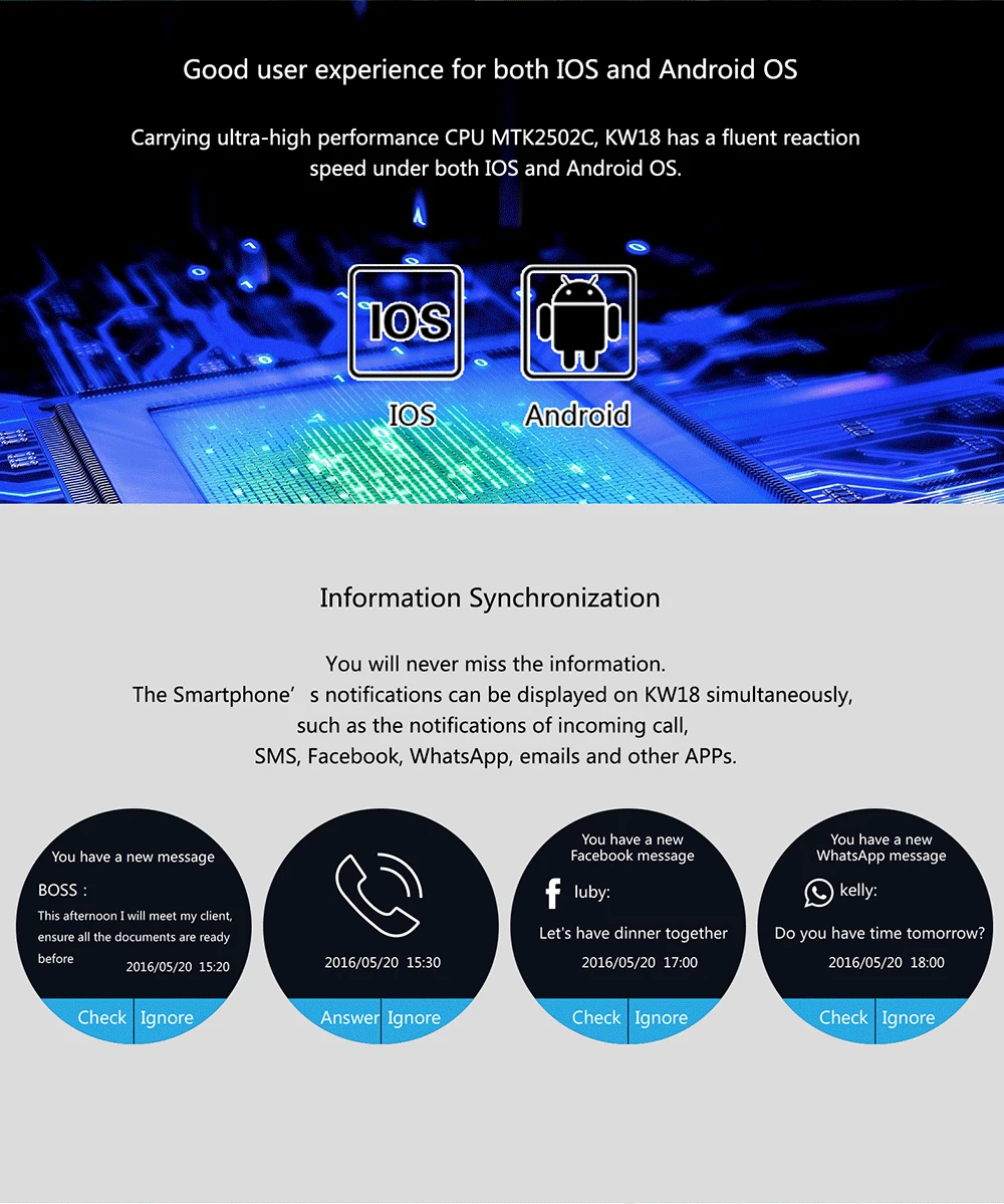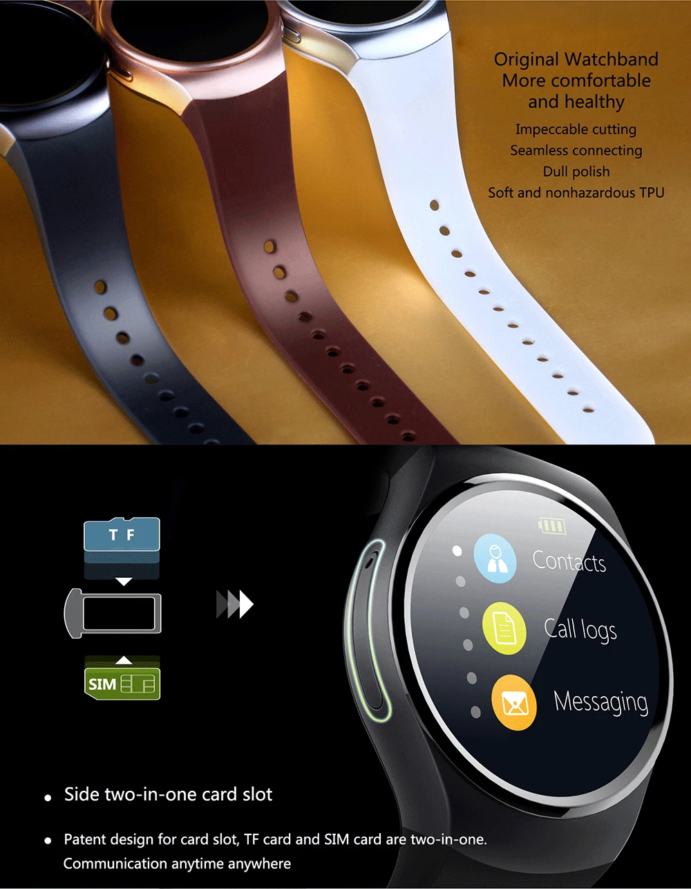 [Основные характеристики] 1. Боковой слот для sim-карты/TF, патентный дизайн для умных часов, что делает его характерным и удобным. 2. Мощные функции: звонящий (вибрация и оповещение о кольцах), шагомер, монитор сна, музыкальный проигрыватель, видеоплеер, диктофон, сидячая сигнализация, caculator, календарь, уведомление, пульс, будильник, удаленная камера, защита от потери и т. Д. 3. Жесты для пробуждения экрана. 4. 1,3 дюймов IPS ЖК-экран, 2,5 D радиан емкостный сенсорный экран, OGS, невоздушный-gap, что делает его более высоким и комфортное ношение 5. Волшебный голос: мужчины, женщины, дети 6. Процессор MTK2502C, идеально поддерживает IOS и Android OS 7. Язык: английский, французский, немецкий, испанский, португальский, итальянский, Нидерланды, русский, польский, турецкий, тайский, Veit Nam, Индия, индонезийский, арабский 8. Поддержка наушников