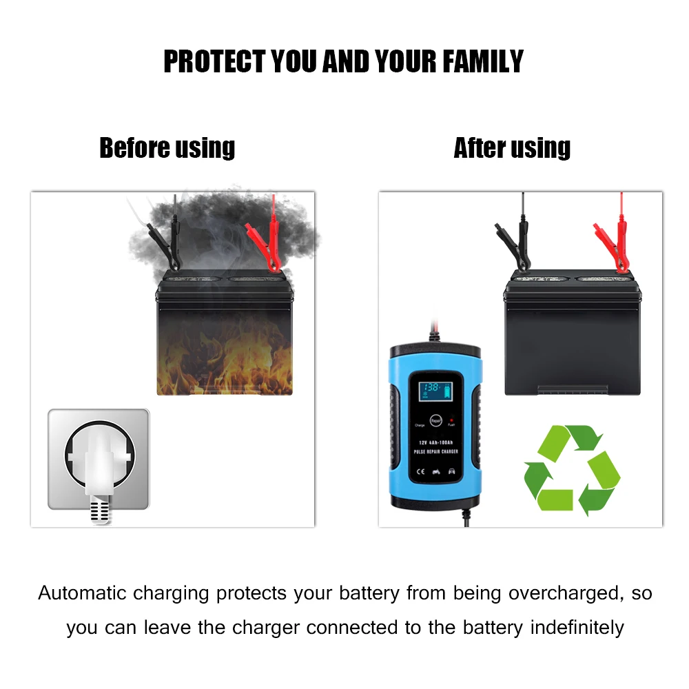 Автоматическая зарядка защищает ваш аккумулятор от перезарядки, поэтому вы можете оставить зарядное устройство, подключенное к батарее на неопределенный срок.