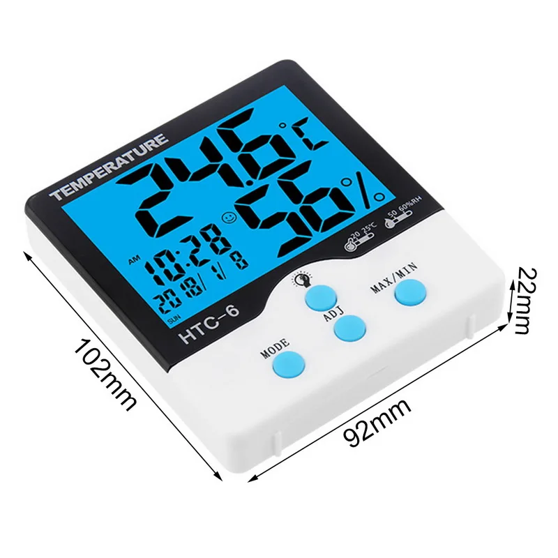 Цвет: черный и белый 1. Датчик температуры и влажности функции: с диапазоном температур от-10 °C до + 50 °C и влажности 10% ∼ 99% RH, показания температуры и влажности показать напрямую 2. Функция времени: Помимо основного отображения времени, этот товар также имеет будильник и календарь (месяц и дата) 3. Функция памяти: при нажатии кнопки памяти, он может отображать память температуры и влажности максимум и минимум 4. Простой Дизайн: с маленьким кронштейном на задней стороне и общим весом около 97 г, его легко разместить и носить с собой 4. Работа батареи: требуется 1 аккумулятор AAA (не входит в комплект) Технические характеристики изделия: