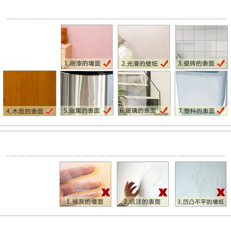 Область применения: 1, гладкие обои 2, окрашенные стены 3, поверхность плитки 4, деревянной поверхности 5, поверхности металла 6, поверхность стекла 7, поверхность пластика Не могут быть применены к стен: 1, серый кирпичная стена 2, поверхность выбоина 3, неровный, обои