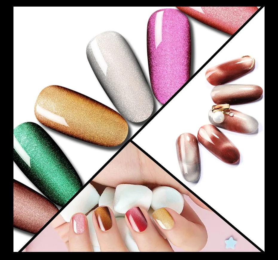 Шаг 5.Нанесите второй слой цветного лака, не вылечивайте и положите магнит на ногти на 10 секунд, чтобы получить эффект кошачьих глаз, И затем немедленно вылечите УФ-лампой в течение 60 секунд или вылечите светодиодный светильник в течение 30 секунд;