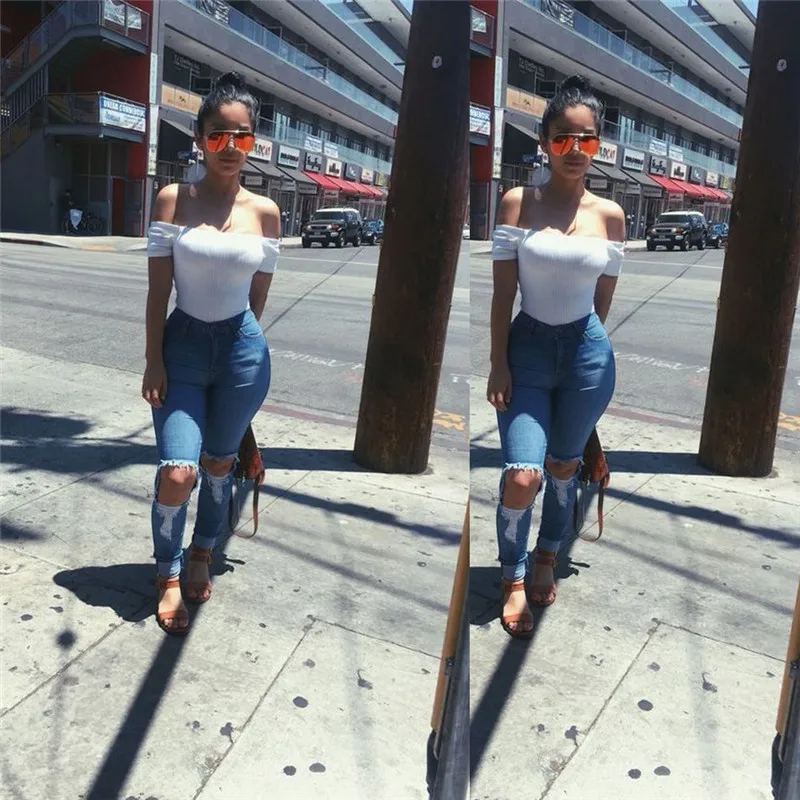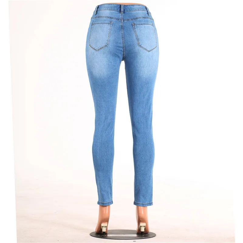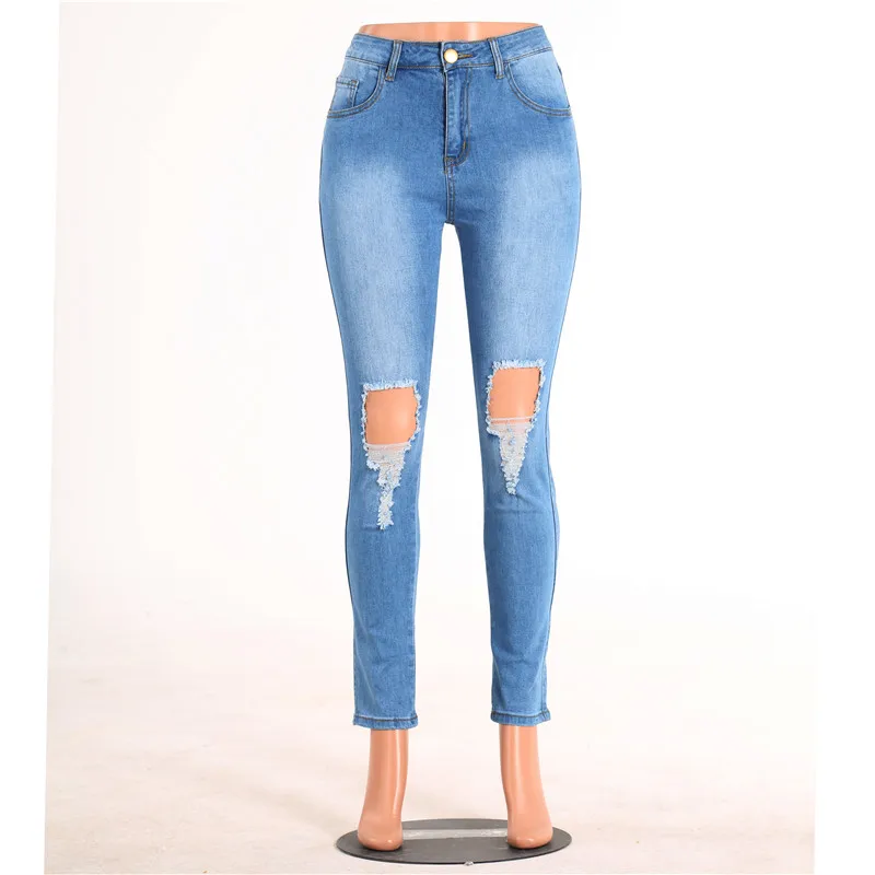 Женские джинсовые брюки с высокой талией, Синие рваные джинсы с дырками, повседневные Стрейчевые брюки, 2019
