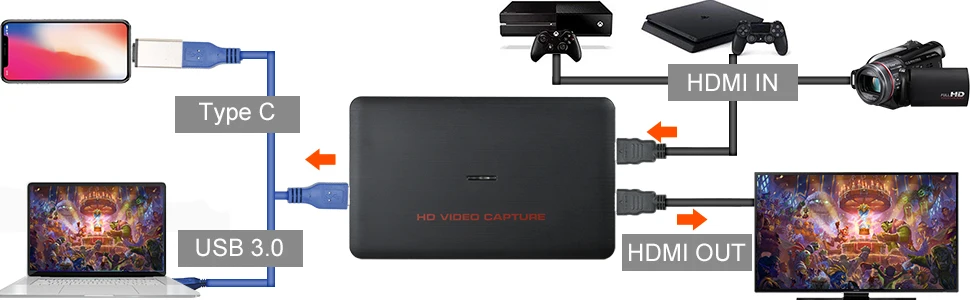 1. 1080P 60fps HD Quality: With high speed USB 3.0 technology, support to capture and transfer 1080P 60FPS HDMI Video signal to your PC, Macbook and mobile phone. (with Type-C adapter) 2. Plug-N-Play: No driver required, true PnP. Game, meeting, live streaming with low latency. Transfer and share the video online. Perfect kit for presenting slides, spreadsheets, documents, and video remotely. 3. No Latency HDMI Loopout: Record audio & video from external devices via HDMI port. There is no latency when you are making a game live streaming. 4. Strong System and Software compatibility: Compatibility with Windows 7,8,10, Linux, OS X 10.9 and later. Work with most video streaming software, like OBS Studio, Adobe Flash Media Live, VLC and etc. 5.Package included: HD video Capture, HDMI to HDMI cable, USB 3.0 to USB 3.0 cable, Type-C Adapter, Using manual