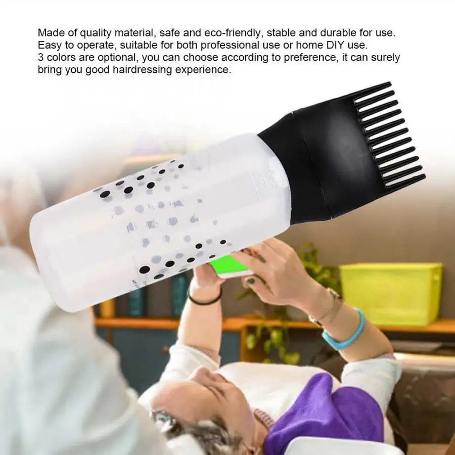 1. Просто заполните бутылку для краски предварительно смешанной краской для волос и используйте ручку действия насоса, чтобы краска текла через головку расчески.